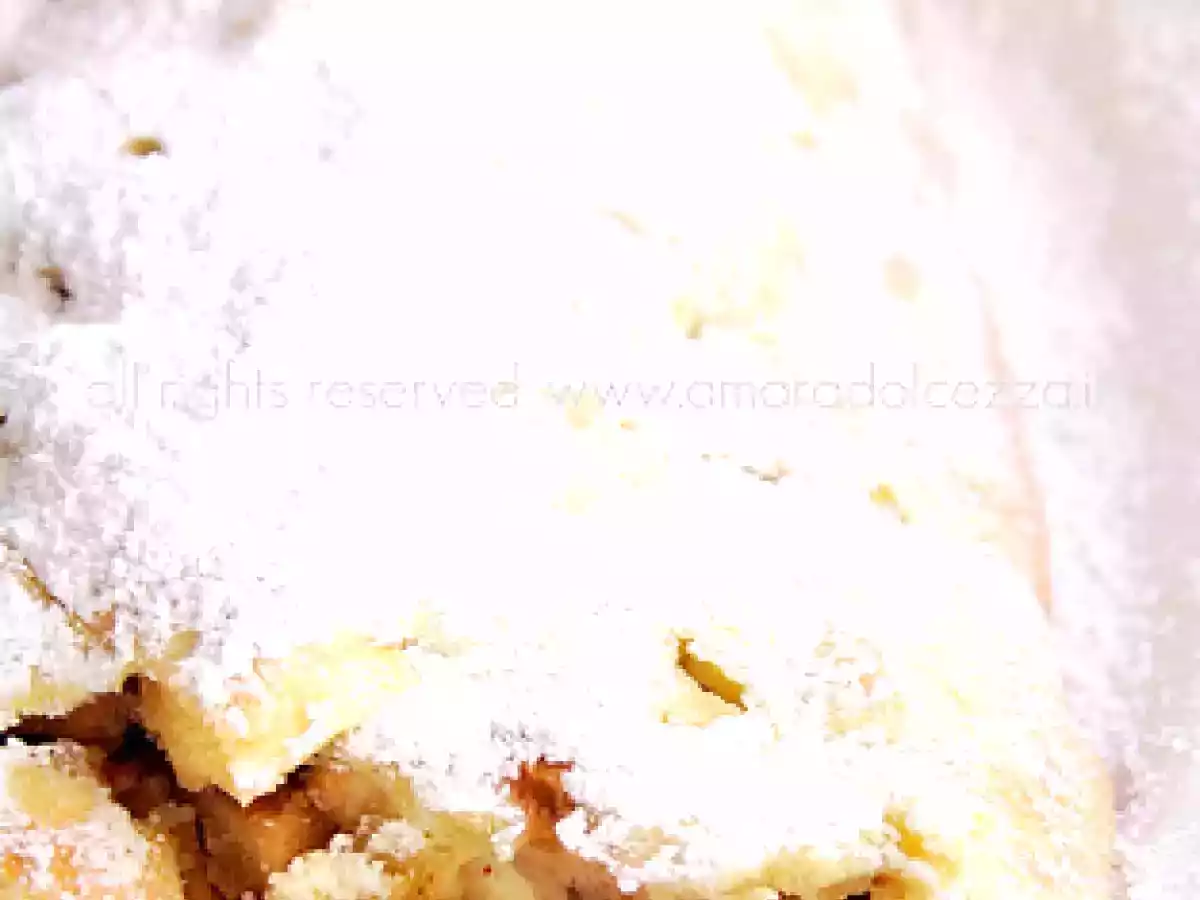 Strudel di mele con pasta frolla PrecedenteProssimo Dessertfacile1 h 20 m740 Kcal Invia questa ricetta ad un amico Stampa la ricetta Contatta l'autore della Ricetta Pubblica la foto di questa ricetta Ingredienti 5 per la pasta frolla da strudel : 120 g di burro freddo di frigo 100 g di zucchero a velo 1 cucchiaino di scorza di limone grattugiata 2 cucchiaini di zucchero vanigliato 1 uovo 1 cucchiaino di panna fresca 300 g di farina 00 1/2 bustina di lievito in polvere per dolci 1 pizzico di sale per il ripieno: 600 g di mele 50 g di zucchero semolato 50 g di pangrattato 40 g di uvetta 20 g di pinoli 2 cucchiai di Rum 2 cucchiaini di zucchero vanigliato 1/2 cucchiaino di cannella in polvere 1 cucchiaino di scorza di limone grattugiata inoltre: 1 uovo sbattuto per spennellare zucchero a velo per spolverizzare Costo stimato: 5.36Euros€ (1.07€/Porzioni)