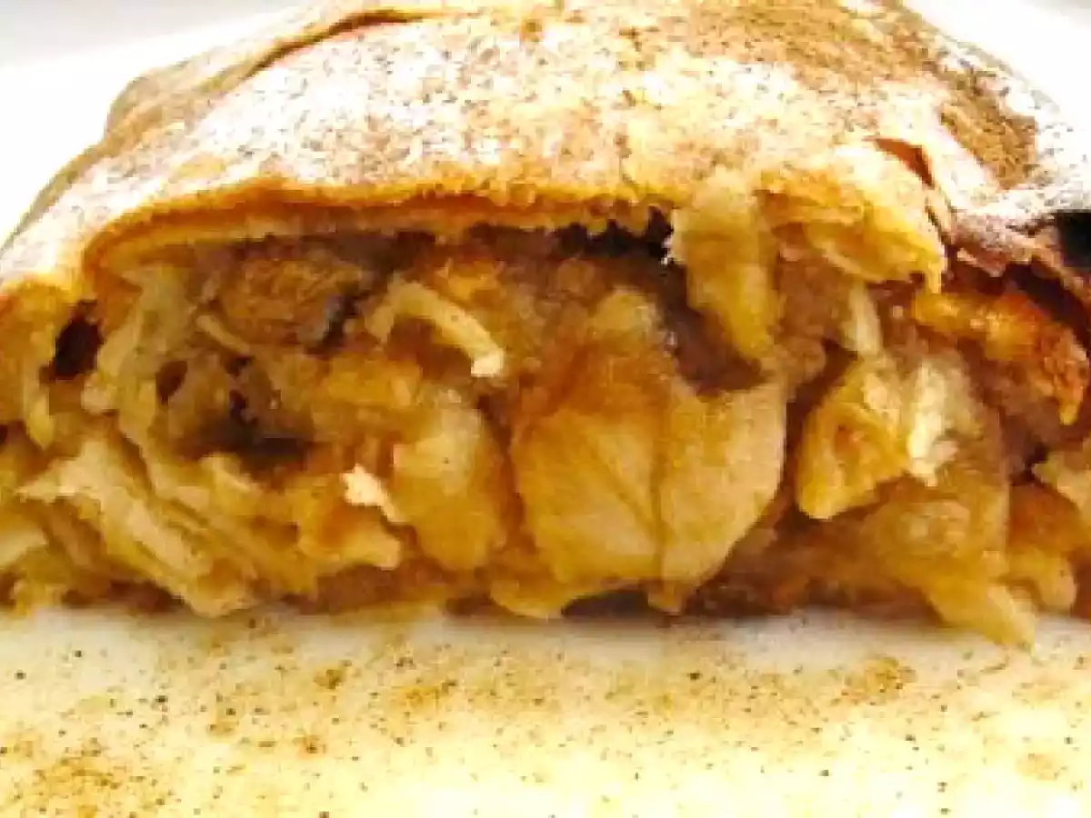 Strudel di mele: ricetta col bimby Dessertfacile1 h 30 m Invia questa ricetta ad un amico Stampa la ricetta Contatta l'autore della Ricetta Pubblica la foto di questa ricetta Ingredienti 7 Per l'impasto: 250 g Farina 00 1 cucchiaino Olio 1 pizzico di Sale 160 g Acqua tiepida 20 g burro 20 g Miele scuro Per il ripieno: 1 kg Mele succo di 1 Limone scorza tritata di 1 Limone 100 g Burro 100 g Uva Sultanina Pinoli 50 g Rum scuro 250 g Zucchero di Canna 30 g Miele di timo 2 cucchiaini di Cannella 20 g Pane grattugiato Zucchero a velo