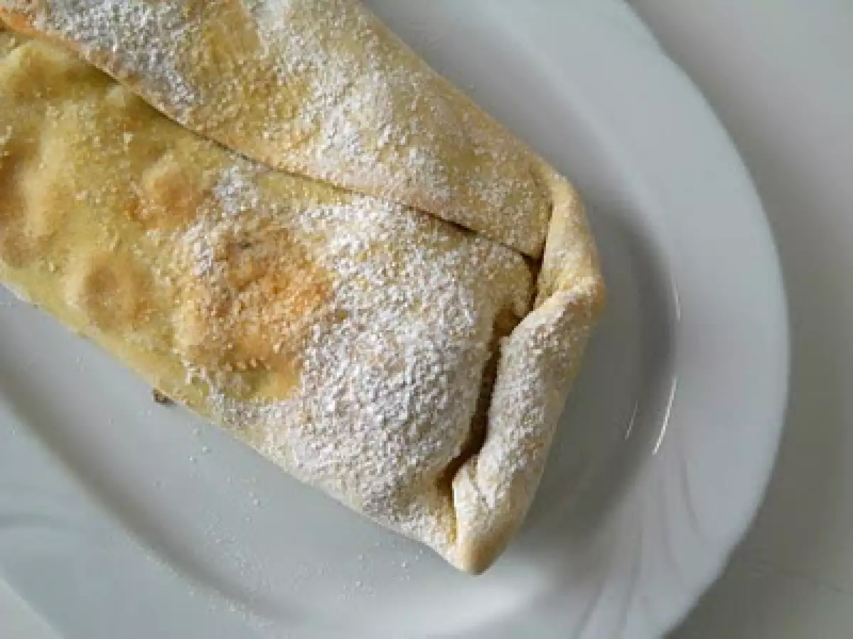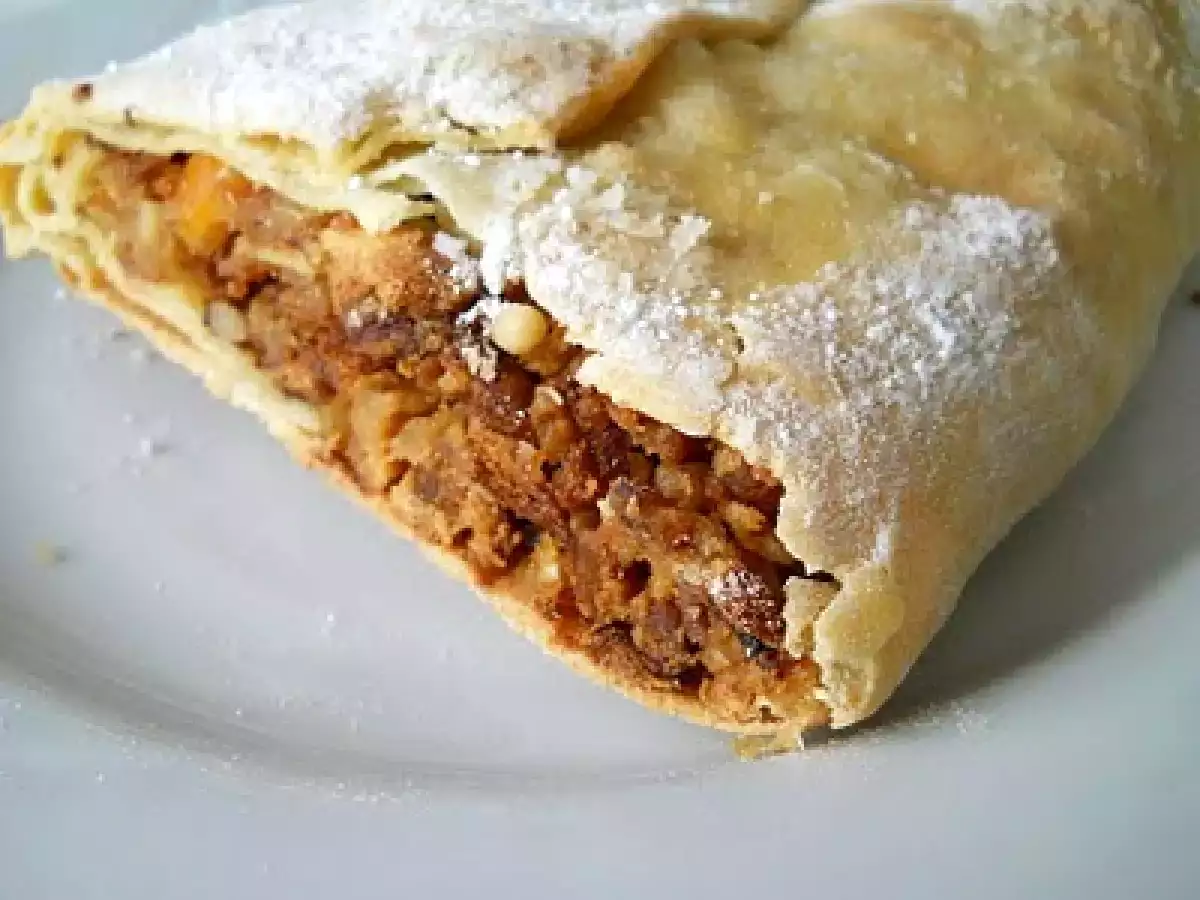 Strudel di panettone e mele PrecedenteProssimo Dessertfacile1 h 5 m Invia questa ricetta ad un amico Stampa la ricetta Contatta l'autore della Ricetta Pubblica la foto di questa ricetta Ingredienti 3 per la pasta : 250 g di farina bianca 0 un pizzico di sale 2 cucchiai di olio di oliva qualche goccia di succo di limone 1 uovo medio acqua tiepida q.b. 50 g di burro fuso zucchero di canna zucchero a velo per decorare per il ripieno : 2 mele piccole 1/2 cucchiaino di cannella in polvere 50 gr di pinoli 6-7 cucchiai di latte freddo q.b. per ammorbidire 1 cucchiaio di succo di limone 1 cucchiaio di zucchero avanzi di panettone q.b.