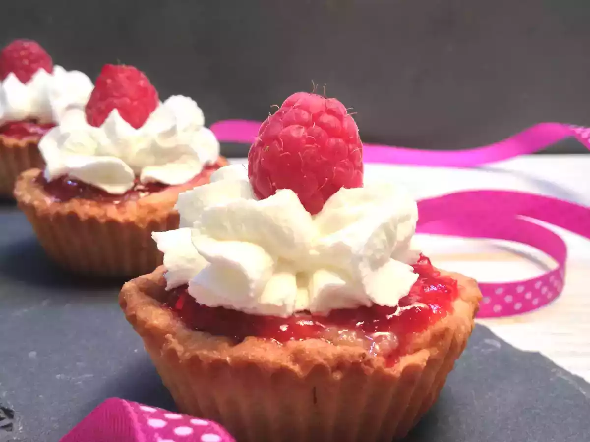 Tartellette con frolla alle fragole, crema pasticcera e coulis di lamponi