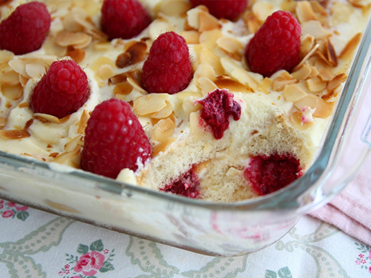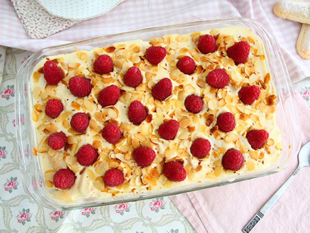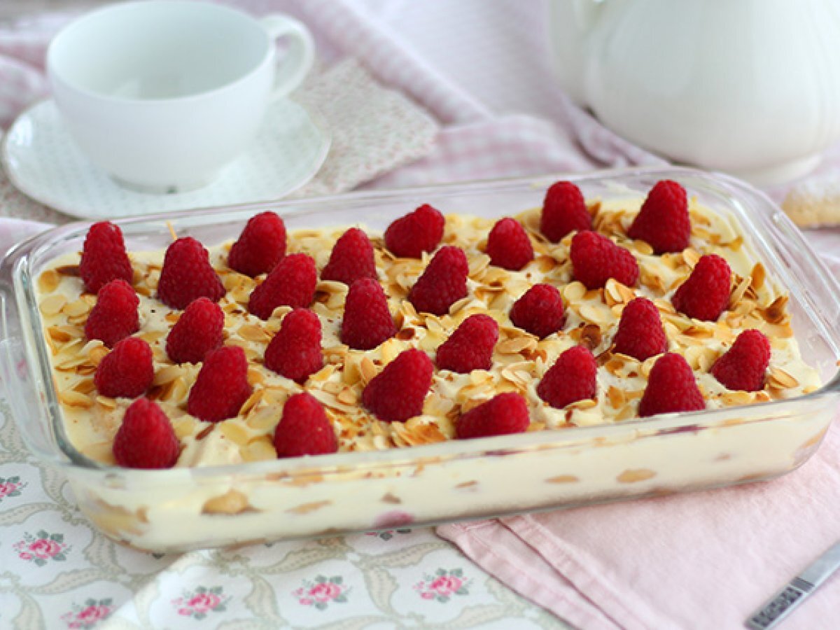 Spolverate la superficie con le lamelle di mandorle ed ultimate con i lamponi. Per finire, lasciate riposare il tiramisù in frigorifero almeno 4 ore