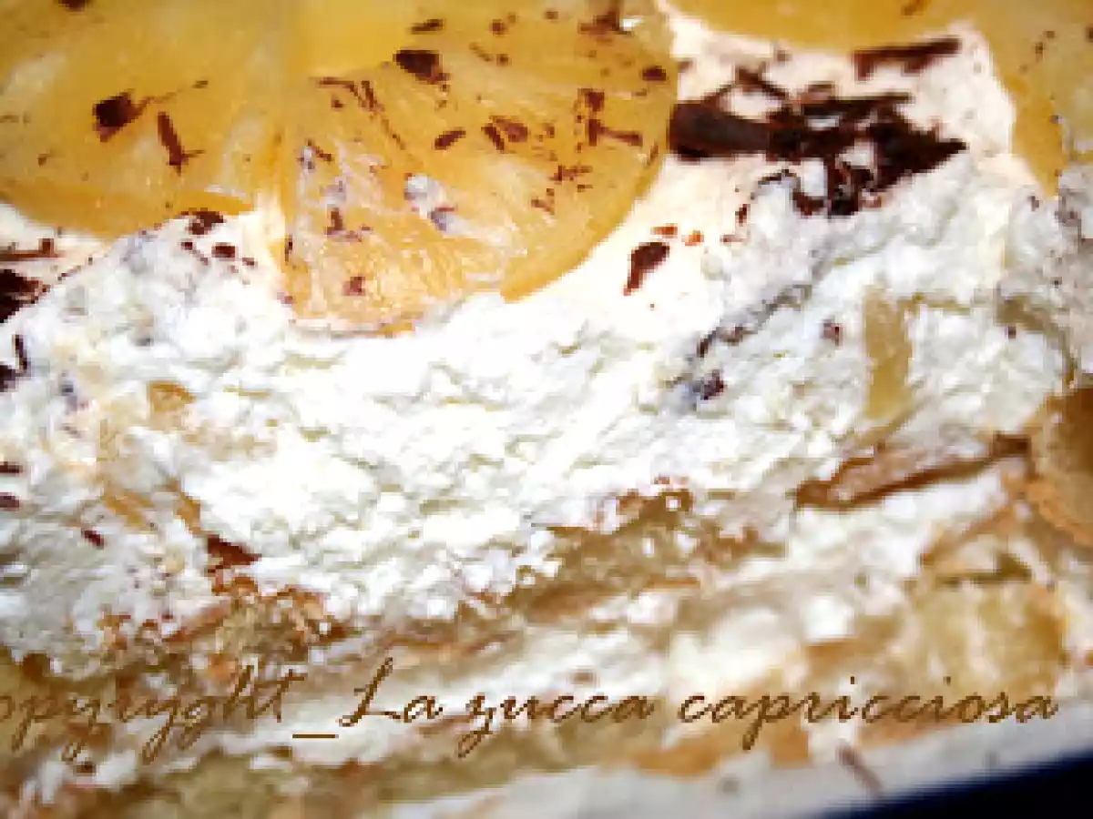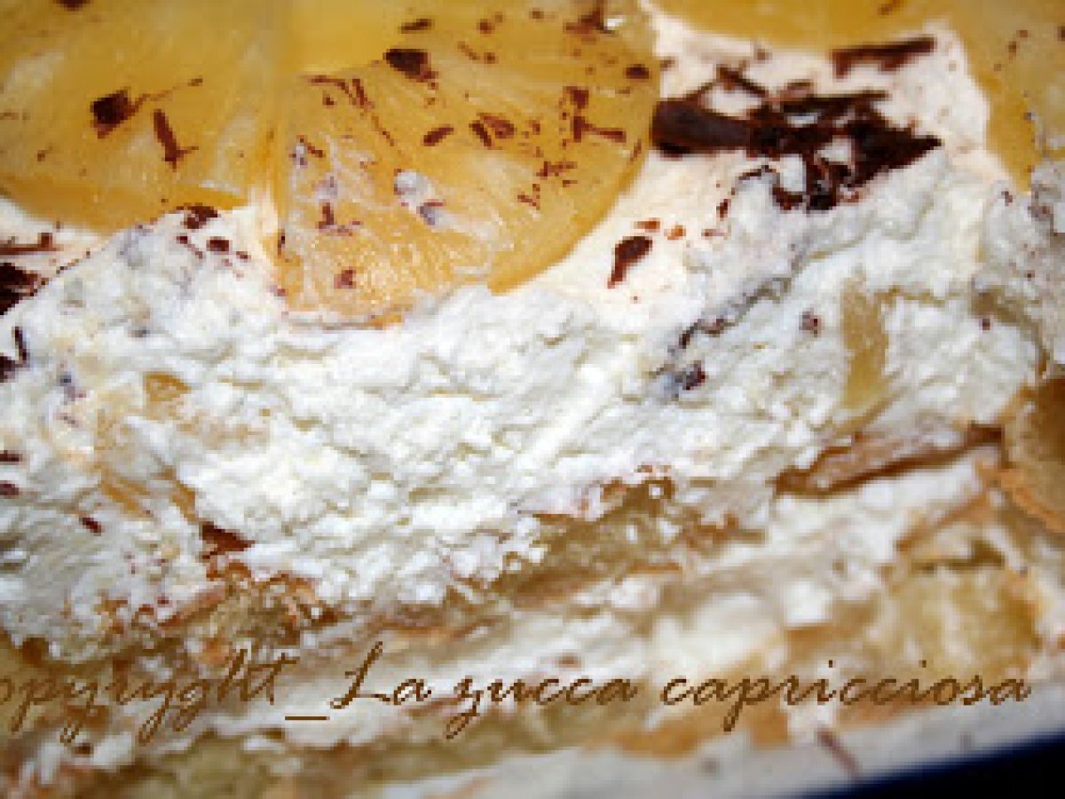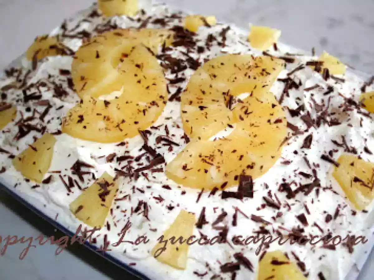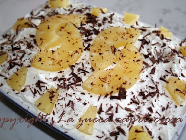 Tiramisù ricotta e ananas PrecedenteProssimo Dessertfacile1 ora Invia questa ricetta ad un amico Stampa la ricetta Contatta l'autore della Ricetta Pubblica la foto di questa ricetta Ingredienti 3 250 gr di ricotta 80 gr di zucchero semolato 1 barattolo di ananas in sciroppo a fette 200 ml di panna già zuccherata succo d'ananas savoiardi cioccolato fondente in tavoletta