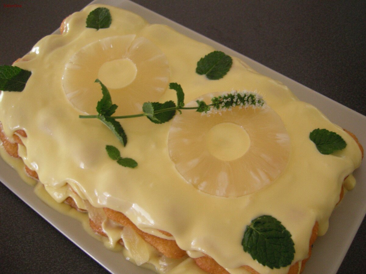 Tiramisu' tropicale Dessertfacile30 min Invia questa ricetta ad un amico Stampa la ricetta Contatta l'autore della Ricetta Pubblica la foto di questa ricetta Ingredienti 6 2 uova 100 gr. di zucchero 250 gr. di mascarpone 2 cucchiai di rhum 1 scatola di ananas sciroppato 1 confezione di Pavesini foglioline di menta fresca q.b. (facoltative)