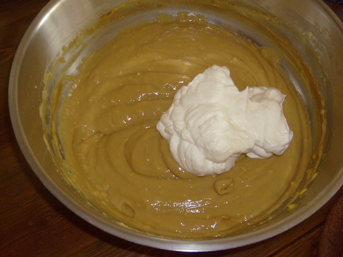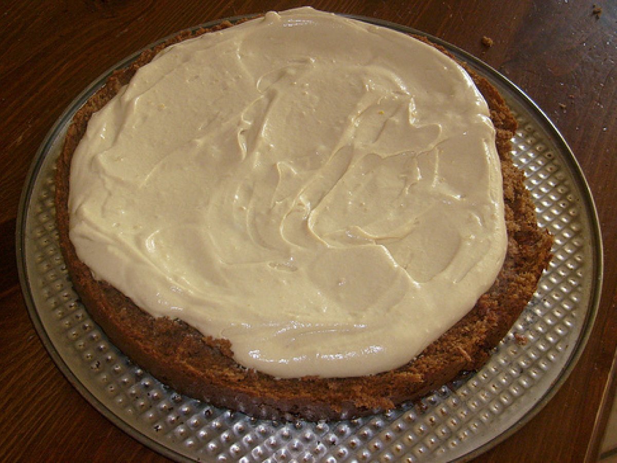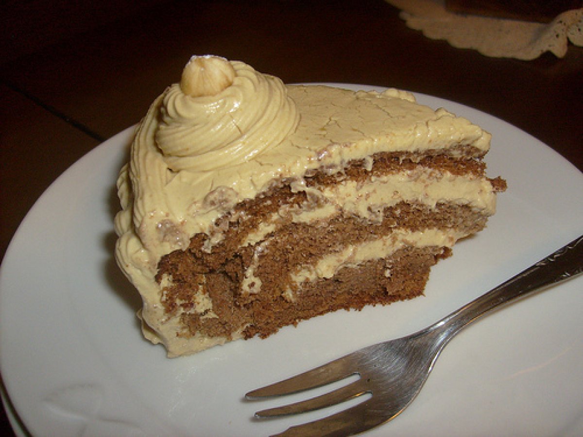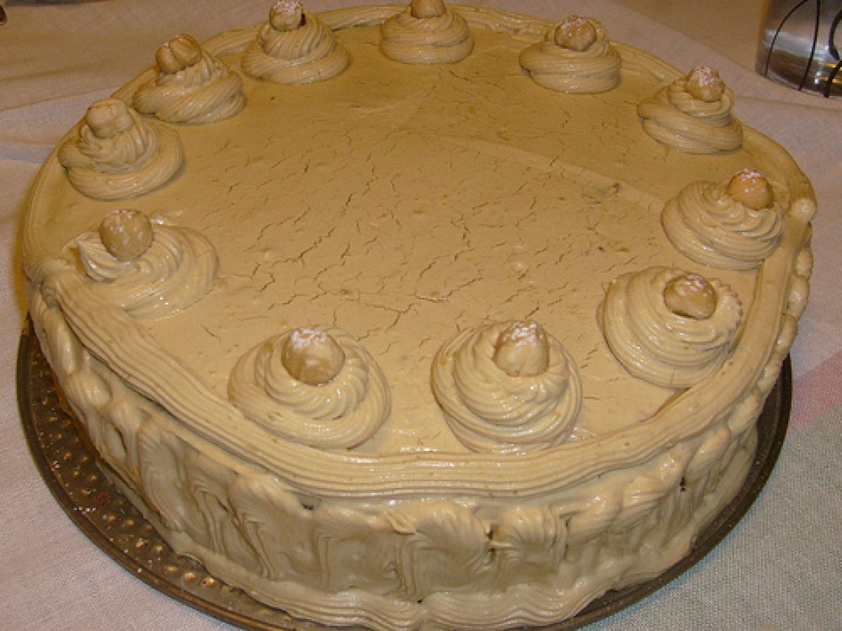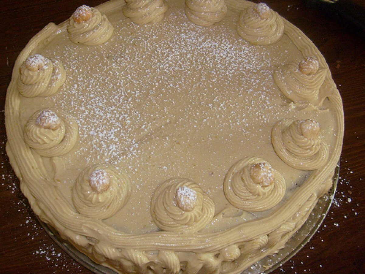 Torta alla crema di caffe' PrecedenteProssimo Dessertfacile1 ora Invia questa ricetta ad un amico Stampa la ricetta Contatta l'autore della Ricetta Pubblica la foto di questa ricetta Per il fine settimana si può cucinare questa torta caffè. Ingredienti 6 Pan di Spagna al cacao: 110g di farina + 40 g di cacao amaro 150g di zucchero 6 uova Per la crema al caffè: 4 tuorli + 1 albume 8 cucchiai di zucchero 1 cucchiaio di liquore al caffè 4 cucchiai di farina 4 bicchieri di latte 1 tazzina di caffè 250 ml di panna da montare 2 fogli di gelatina Per la decorazione: Crema al caffè nocciole intere