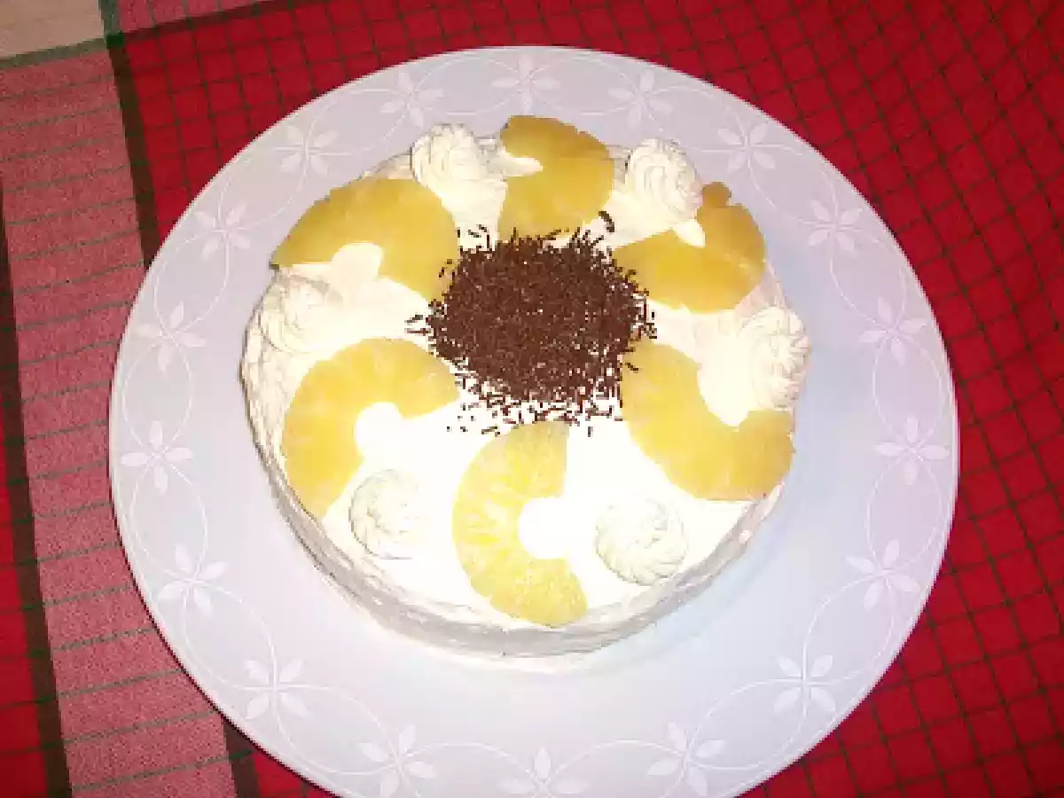 Torta ananas e mascarpone Dessertfacile1 h 5 m Invia questa ricetta ad un amico Stampa la ricetta Contatta l'autore della Ricetta Pubblica la foto di questa ricetta Ingredienti 4 Per un pan di Spagna da 18cm: 2 uova, 80 g di zucchero 80 g di farina 20 g di olio di semi buccia grattugiata di 1/2 arancia 2 cucchiaini di lievito per dolci Per la farcia: 250 g di mascarpone 50/100 g di zucchero a velo 200 g di ananas sgocciolato codette di cioccolato Per la bagna: succo d'ananas acqua q.b.