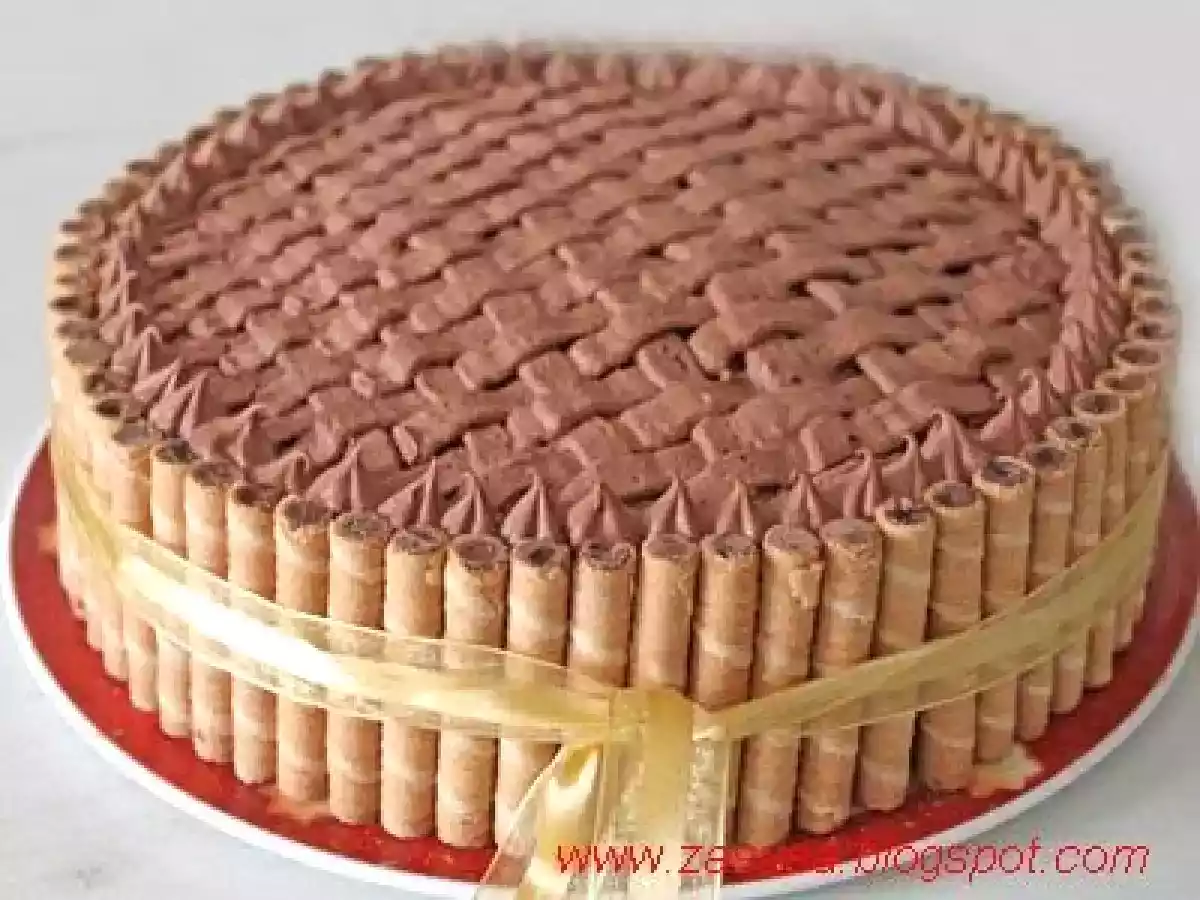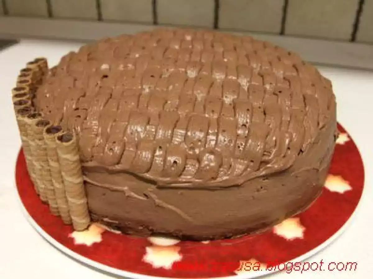 Torta con decorazione effetto canestro PrecedenteProssimo Dessertfacile1 h 10 m Invia questa ricetta ad un amico Stampa la ricetta Contatta l'autore della Ricetta Pubblica la foto di questa ricetta Ingredienti 6 per il pan di spagna al cacao : 6 uova 225 g di zucchero 190 g di farina 00 40 g di cacao 1 bustina di lievito per la farcia : crema pasticcera 150 g di cioccolato fondente 200 ml di panna montata per la bagna : 200 ml di acqua 2 cucchiai di zucchero 2 cucchiai di rhum per la copertura : 500 ml di panna 200 g di cioccolato fondente biscotti roll q.b.