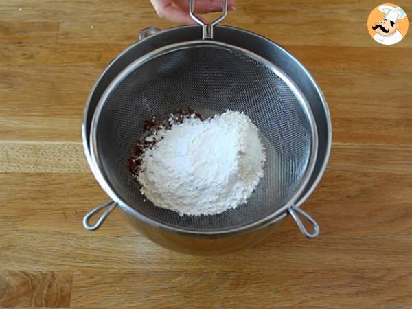 Setacciate il cacao, la farina ed il lievito nella ciotola, poi aggiungete il sale ed incorporate per bene aiutandovi con una spatola