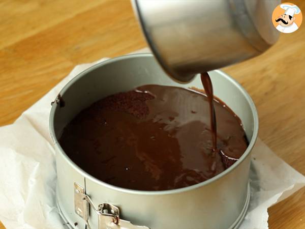 Sistemate il nastro acetato intorno al pan di Spagna, poi ricoprite la superficie con la mousse di cioccolato. Livellate per bene e lasciate riposare in frigorifero per 30 minuti.