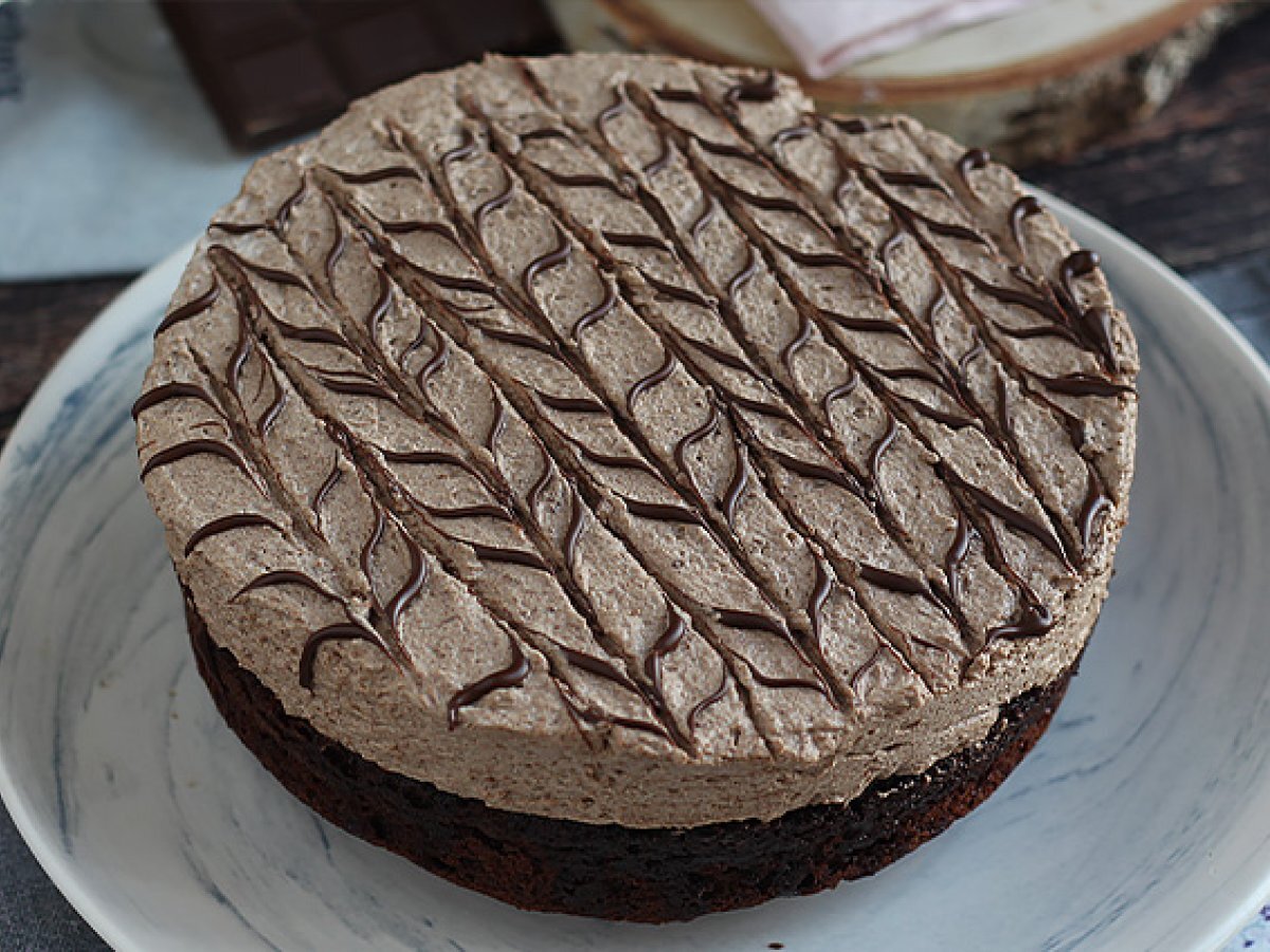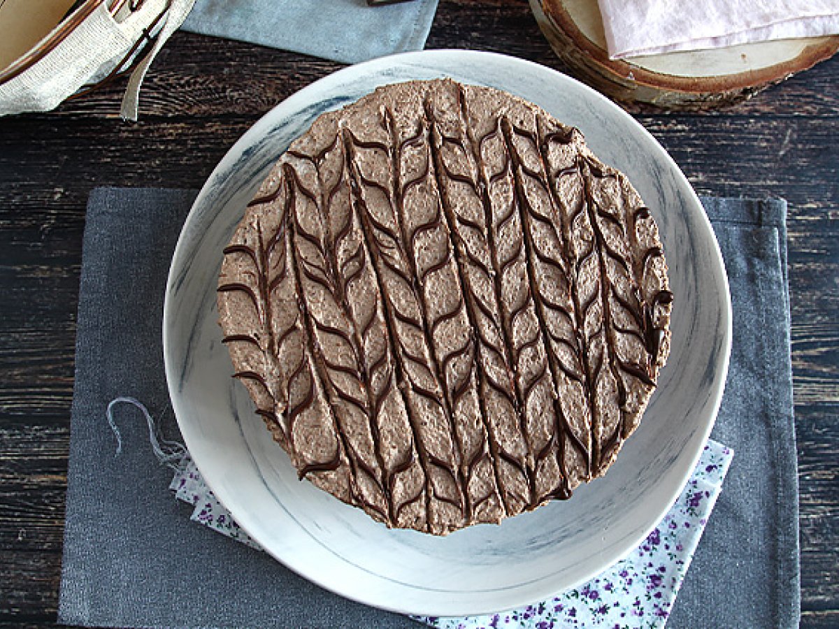 Adesso sciogliete un po' di cioccolato fondente e trasferitelo in una sac à poche. Utilizzate un beccuccio sottilissimo e fate delle linee orizzontali su tutta la mousse.