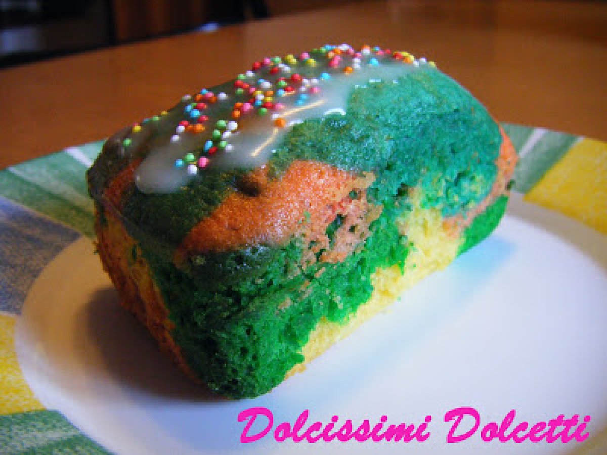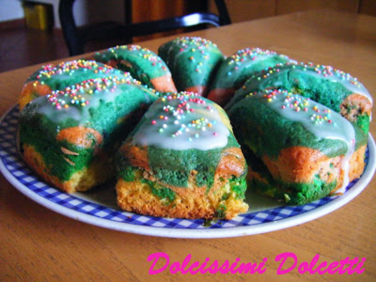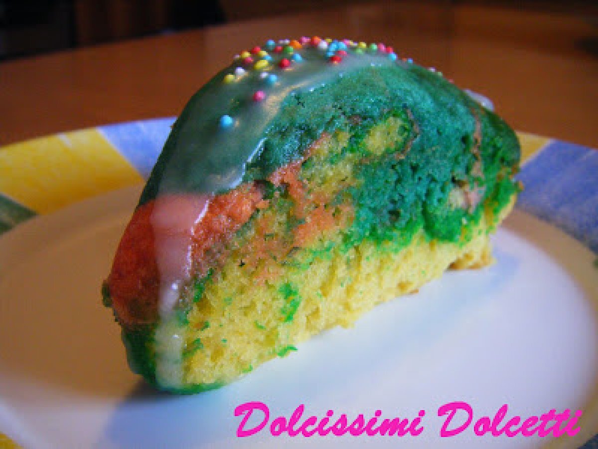 Torta di carnevale multicolor allo yogurt vota adesso PrecedenteProssimo Dessertfacile1 ora Invia questa ricetta ad un amico Stampa la ricetta Contatta l'autore della Ricetta Pubblica la foto di questa ricetta Ingredienti 4 3 uova 150 g di zucchero qualche goccia di aroma di vaniglia 150 g di yogurt bianco 50 g di olio sale 270 g di farina 00 1 bustina di lievito per dolci coloranti alimentari di vari colori Per la glassa: zucchero a velo succo di limone acqua q.b. zuccherini colorati
