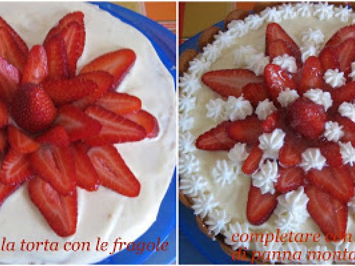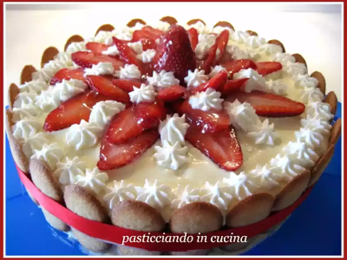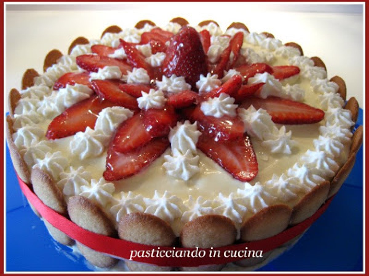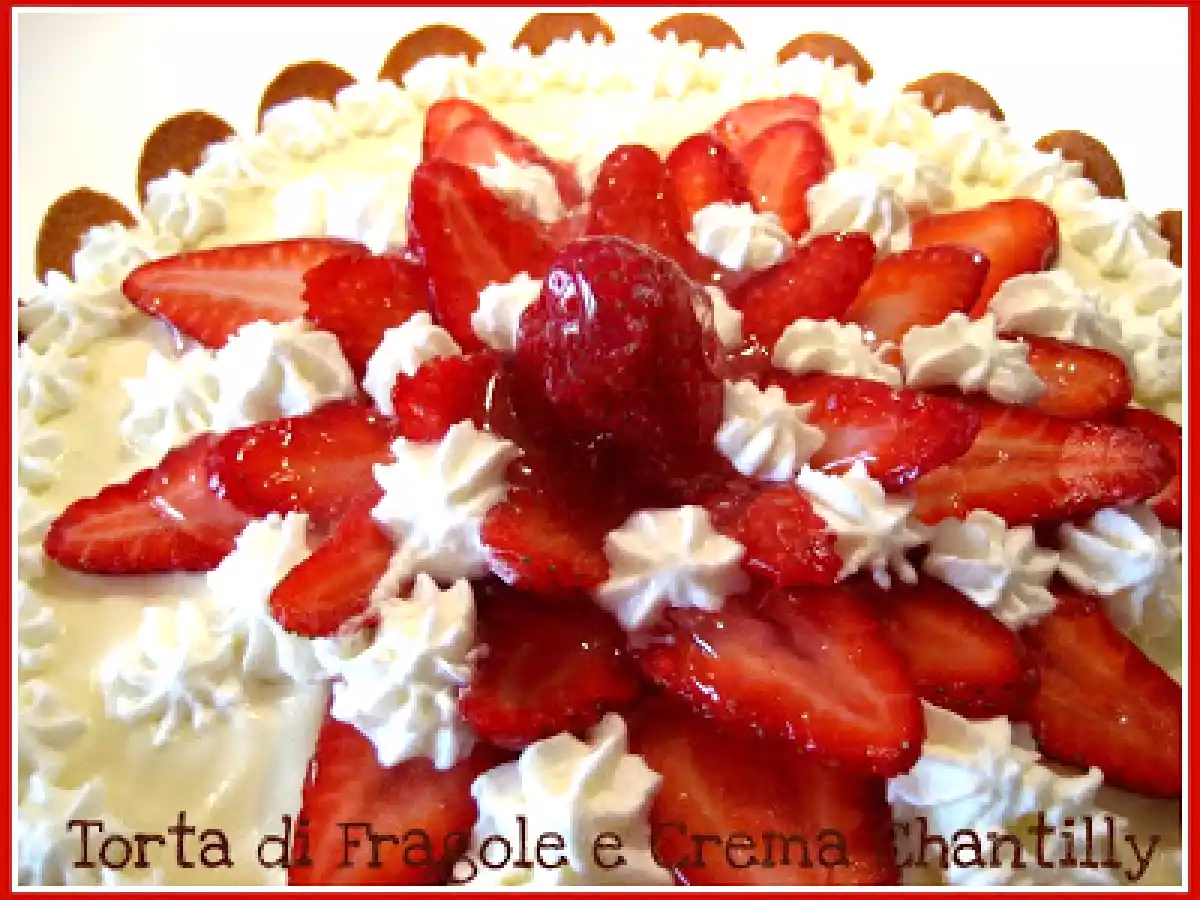Torta di fragole, mandorle e crema chantilly PrecedenteProssimo Dessertfacile30 min Invia questa ricetta ad un amico Stampa la ricetta Contatta l'autore della Ricetta Pubblica la foto di questa ricetta Questo è un tipo di decorazione. Ingredienti 8 1 pan di spagna crema chantilly 500 g di fragole mandorle in lamelle biscotti tipo lingue di gatto 250 ml di panna fresca da montare 1 nastro rosso