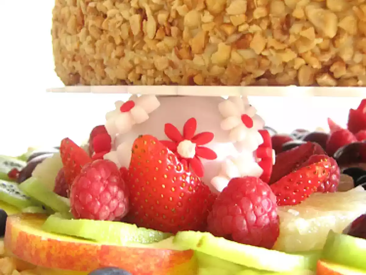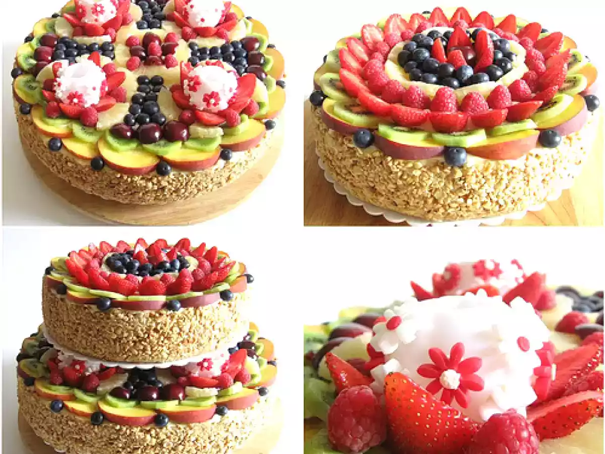 Torta di frutta per angelica PrecedenteProssimo Dessertfacile1 h 40 m Invia questa ricetta ad un amico Stampa la ricetta Contatta l'autore della Ricetta Pubblica la foto di questa ricetta Una grande torta con frutta di stagione. Ingredienti 15 Pan di spagna (36cm): 11 uova grandi 440 g Zucchero 440 g Farina per Dolci Soffici 1 Stecca di Vaniglia Crema chantilly: Crema Pasticcera Panna fresca Pan di spagna (28cm): 7 Uova grandi 280 g Zucchero 280 g Farina per Dolci Soffici 1/2 Stecca di Vaniglia Crema pasticcera: 2L Latte Intero 400gr Zucchero 8 Uova 120 g Farina 80 g Maizena Bagna al rum: 150 g Acqua 70 g Zucchero 150 g Rum