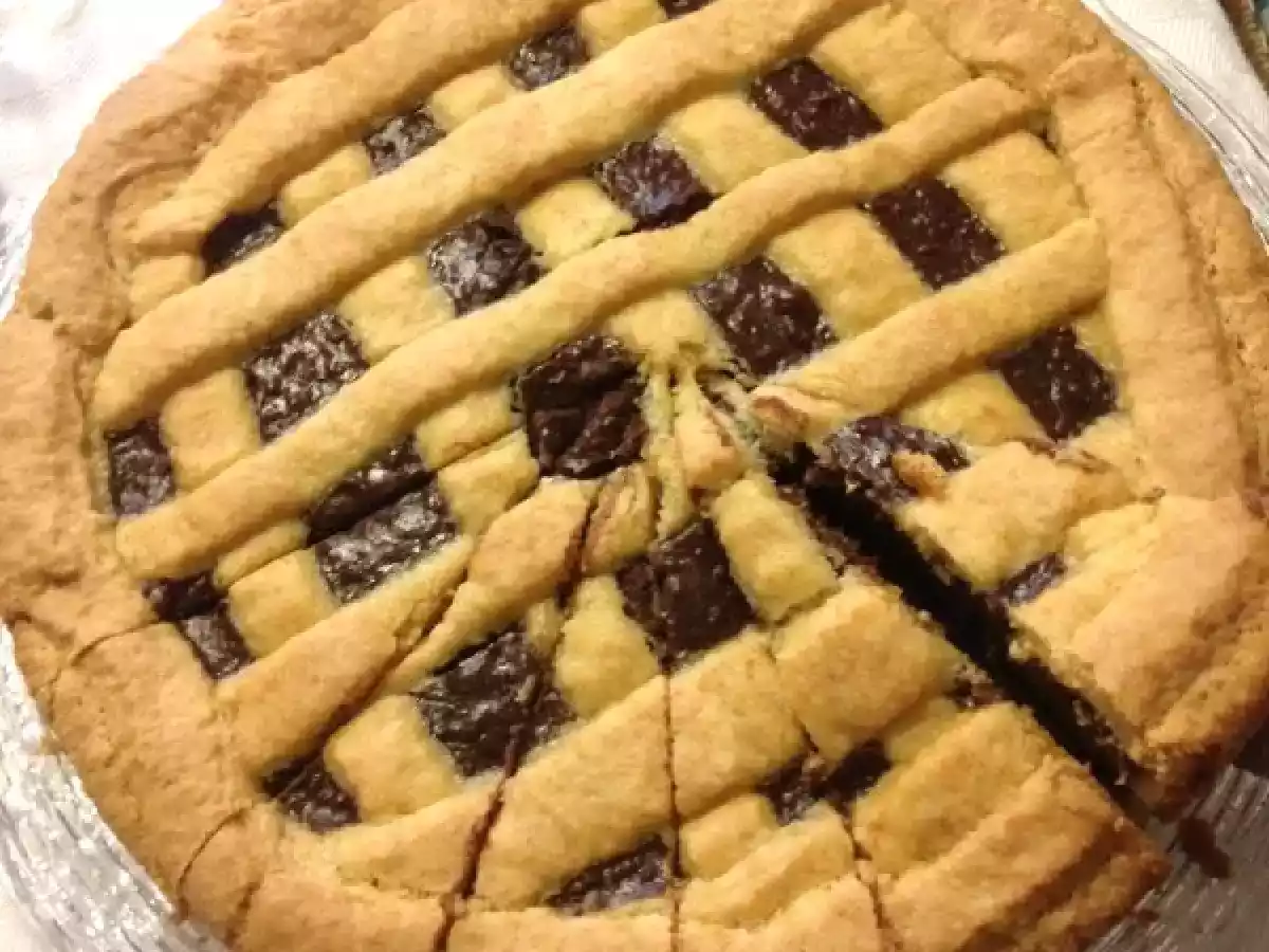Una crostata a base di riso cotto nel latte e cioccolato fondente