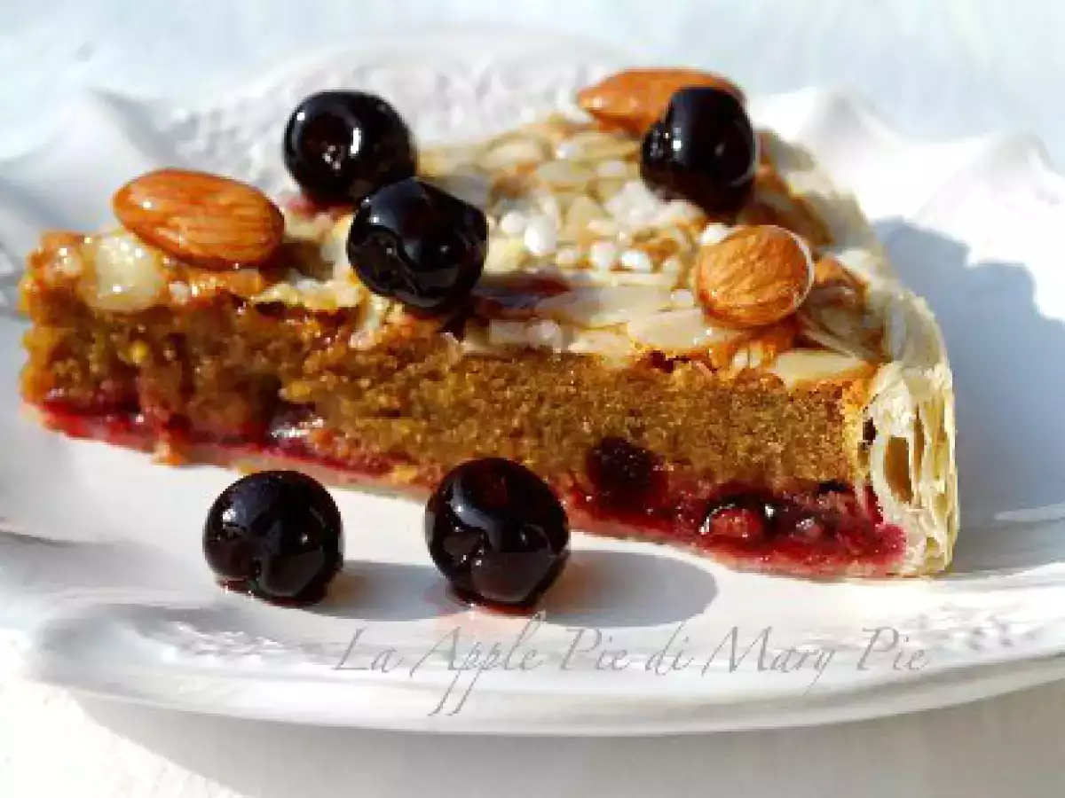Torta di sfoglia al farro, mandorle e amarene Dessertmedia1 ora Invia questa ricetta ad un amico Stampa la ricetta Contatta l'autore della Ricetta Pubblica la foto di questa ricetta Ingredienti 8 Per uno stampo di 26 cm di diametro Per il composto di mandorle e farro: 125 g mandorle con la buccia 25 g mandorle amare (armelline) 35 g farina di farro integrale 130 g zuccchero di canna grezzo 125 g burro a temperatura ambiente 100 g tuorli 200 g albumi Per la finitura: 400 g pasta sfoglia fatta con farina di farro (io ho usato un prodotto surgelato che del farro non aveva neanche l'ombra) 40 g confettura di amarene 65 g amarene snocciolate 80 g mandorle a filetti 35 g zucchero in granella Gelatina di albicocche q.b. Mandorle intere con la buccia q.b. Amarene snocciolate q.b.