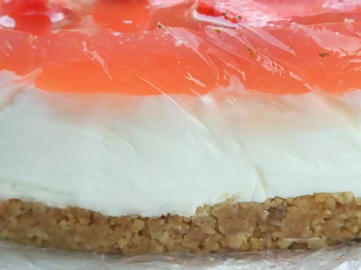 Torta di yogurt e gelatina di fragole PrecedenteProssimo Dessertfacile55 min Invia questa ricetta ad un amico Stampa la ricetta Contatta l'autore della Ricetta Pubblica la foto di questa ricetta Ingredienti 4 per il fondo 220 g Biscotti secchi 150 g Burro fuso 2 cucchiai Zucchero di canna per la crema di yogurt 6 g colla di pesce 4 cucchiai latte fresco intero 200 ml panna fresca da montare 500 ml yogurt cremoso già zuccherato per la gelatina di fragole 6 g colla di pesce 500 g fragole 2 cucchiai di succo di limoni 100 ml acqua 60 g Zucchero