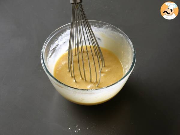 In una ciotola sbattete le uova e lo zucchero, poi aggiungete levieto e farina e mescolate per bene.