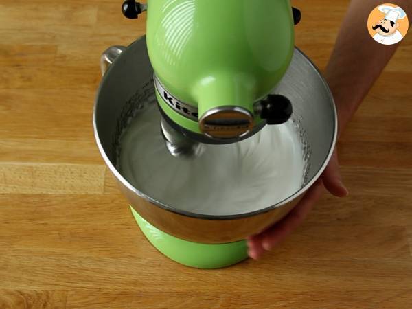 Scaldate lo zucchero e l'acqua in un pentolino fino ad arrivare alla temperatura di 116°C. In questo punto battete a velocità massima gli albumi. Quando lo sciroppo arriverà a 118°C incorporatelo a filo negli albumi continuando a montare.