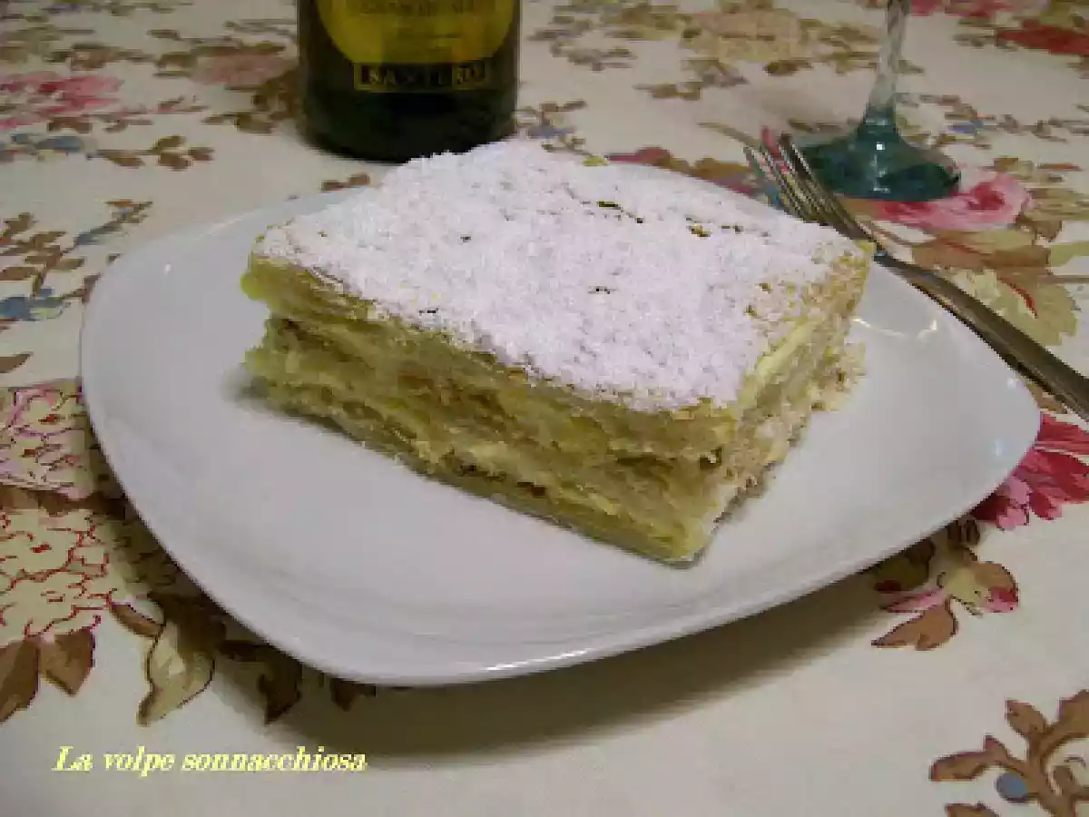 Torta millefoglie alla crema Dessertfacile45 min1343 Kcal Invia questa ricetta ad un amico Stampa la ricetta Contatta l'autore della Ricetta Pubblica la foto di questa ricetta Ingredienti 2 1 rotolo di pasta sfoglia rettangolare 1 tuorlo mezzo bicchiere di latte 1 cucchiaio di farina 1 cucchiaio e mezzo di zucchero mezza buccia di limone grattuggiata 1 confezione di panna da montare zucchero a velo 1 cucchiaio di cocco grattuggiato Costo stimato: 3.09Euros€ (1.55€/Porzioni)
