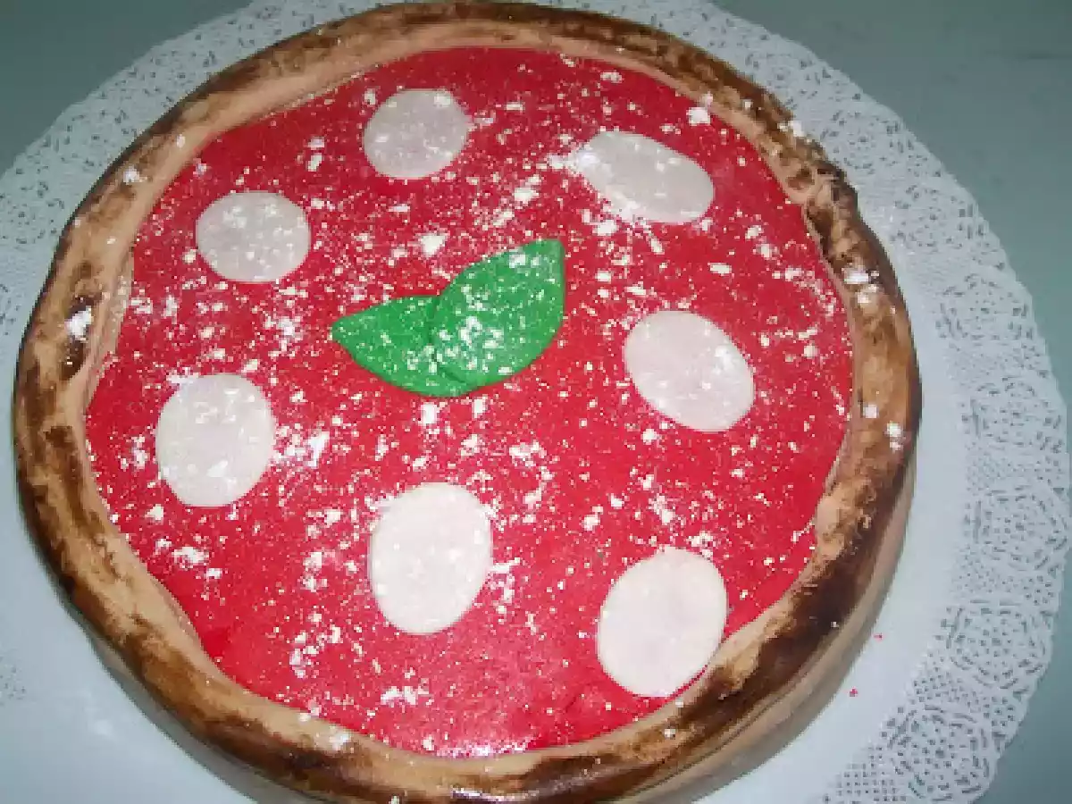 Torta pizza margherita PrecedenteProssimo Dessertfacile1 h 32 m1319 Kcal Invia questa ricetta ad un amico Stampa la ricetta Contatta l'autore della Ricetta Pubblica la foto di questa ricetta Ingredienti 4 8 uova 240 g zucchero 200 g farina 1 b. lievito Per la crema: 500 g latte 100 g zucchero 2 uova 70 g farina 1 fiala aroma limone Per la pdz: 450 g zucchero a velo 30 g acqua 50 g miele 5 g colla di pesce Costo stimato: 3.93Euros€ (0.98€/Porzioni)