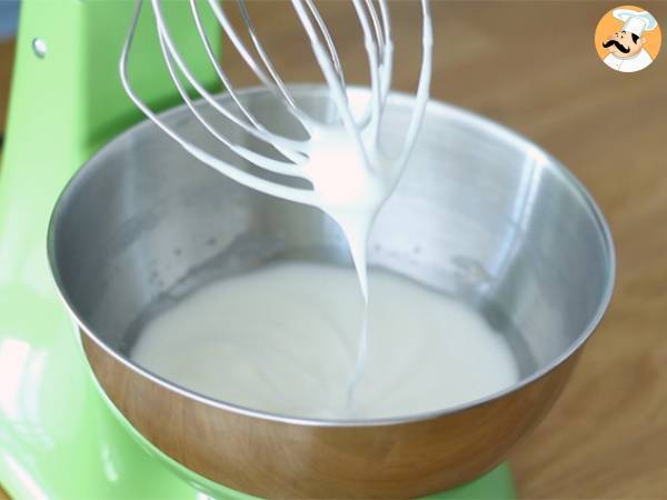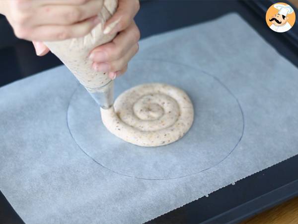 Disegnate un cerchio sulla superficie di un foglio di carta da forno (diametro 18 cm) . Poi, aiutandovi con un sac à poche, riempitelo con il composto appena preparato. Quindi infornate per 12 minuti a 190°C.