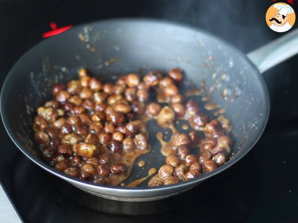 Mescolate in continuazione fino a quando si formerà il caramello intorno alle nocciole. Quando sarà pronto versate il tutto su una teglia foderata di carta da forno e lasciate raffreddare.