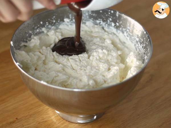 Montate la panna fresca con le fruste elettriche. Sciogliete il cioccolato e versatelo sulla panna montata