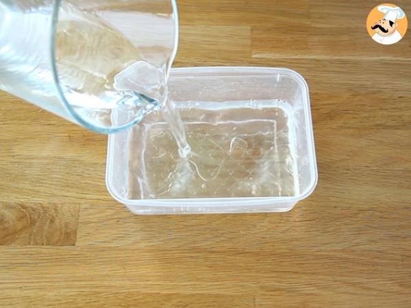 Immergete i fogli di gelatina nell'acqua fredda. Poi mescolate tutti gli altri ingredienti in un pentolino. (non utilizzate le fruste per mescolare perché potrebbero creare delle bolle d'aria nella preparazione e non permetteranno l'effetto specchio desiderato)