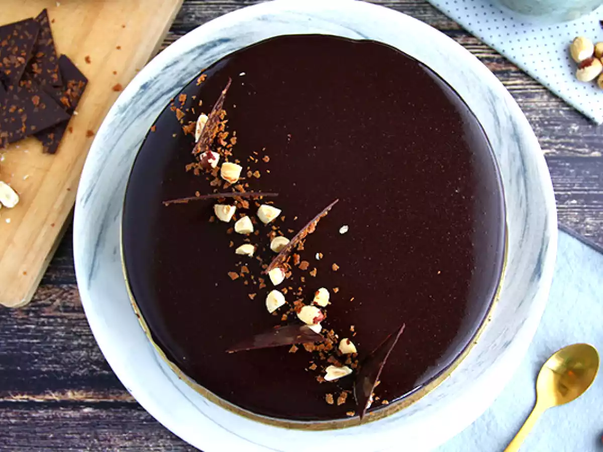 La glassa a specchio è sicuramente la parte più difficile di questo dessert. Se volete evitare questo passaggio, potete spolverare il dolce con del cacao amaro e ed utilizzare dei pezzi cioccolato come decorazione