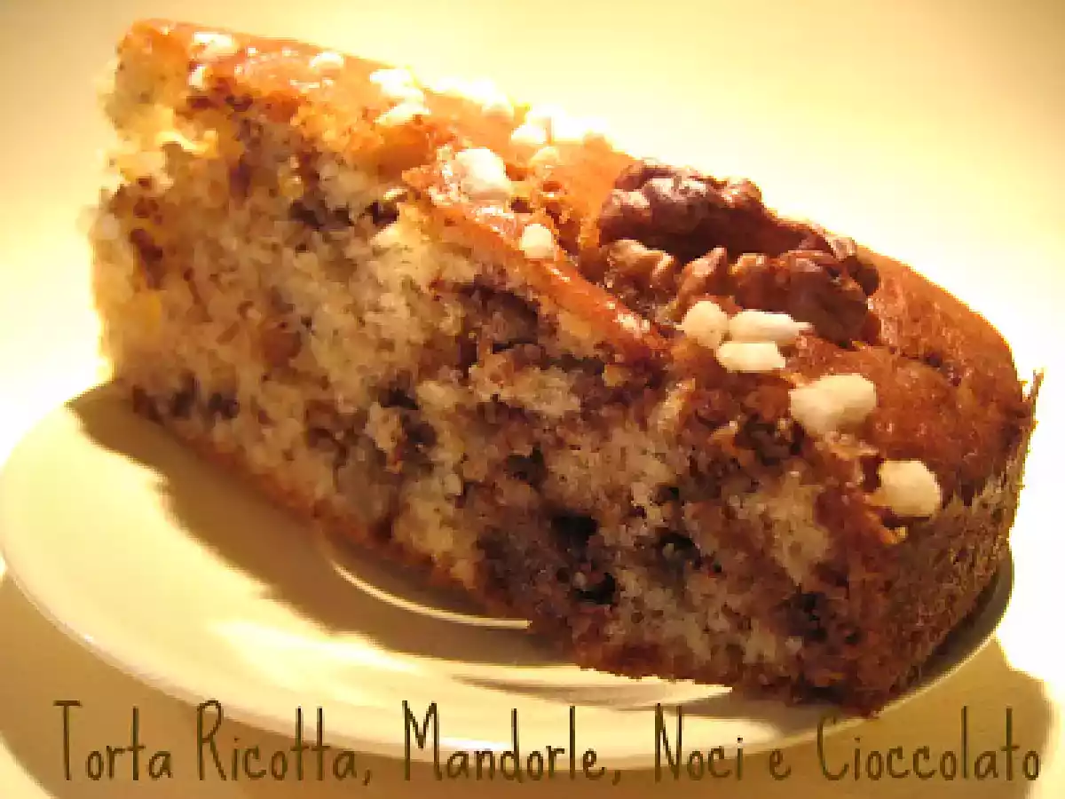 Torta ricotta, mandorle, noci e cioccolato PrecedenteProssimo Dessertfacile1 ora Invia questa ricetta ad un amico Stampa la ricetta Contatta l'autore della Ricetta Pubblica la foto di questa ricetta Una torta piena di sapore e di delizia! Ingredienti 5 300 g di farina 3 uova 60 g di noci 100 g di mandorle tritate 80 g di burro 250 g di ricotta 1 bustina di lievito poche gocce di estratto di vaniglia o 1 bustina di vanillina 1/2 bicchiere di latte 150 g di zucchero cioccolato per decorare granella di zucchero 12 gherigli di noce