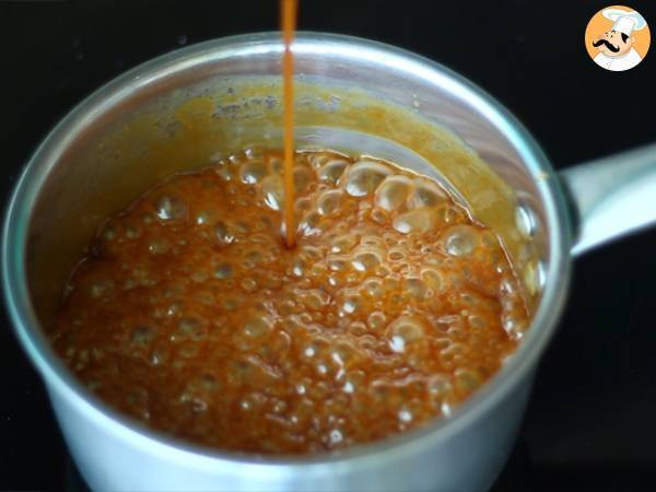 Sciogliete lo zucchero in un pentolino senza muoverlo (potete scuoterlo leggermente, di tanto in tanto, se preferite). Quando si sarà formato il caramello aggiungete il burro.