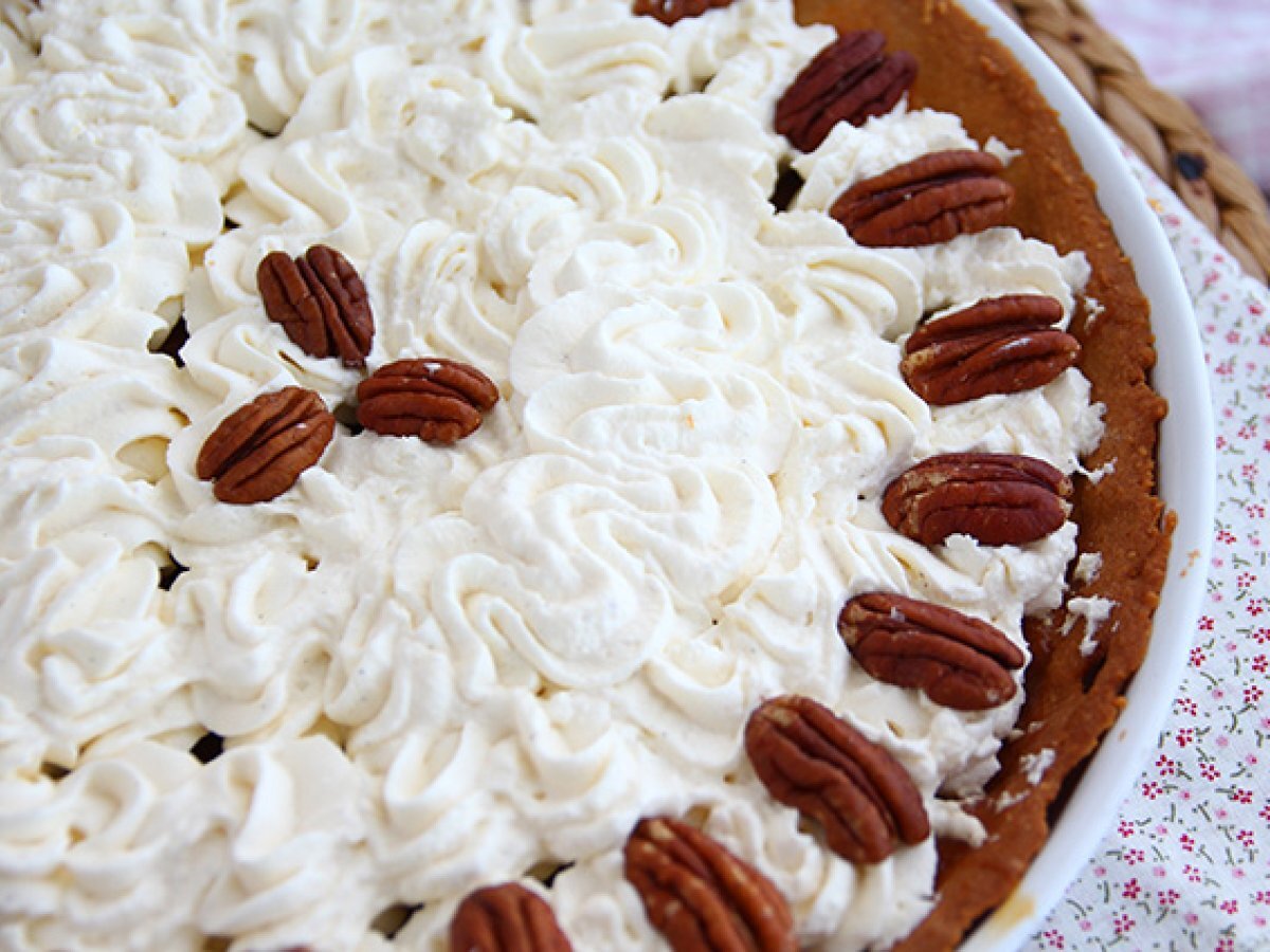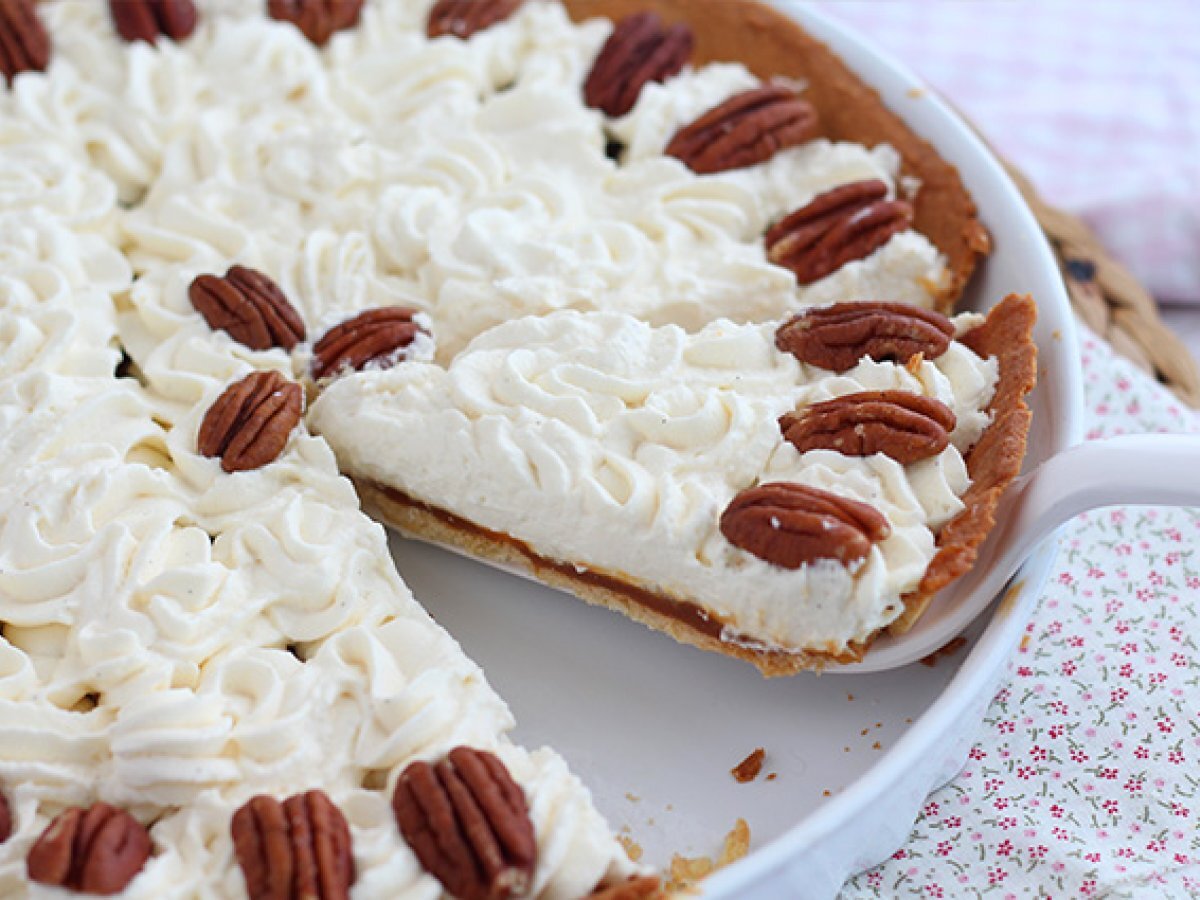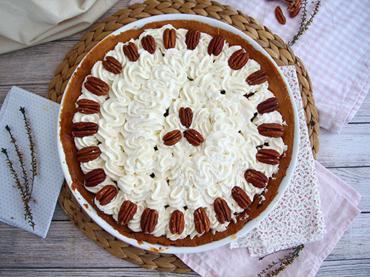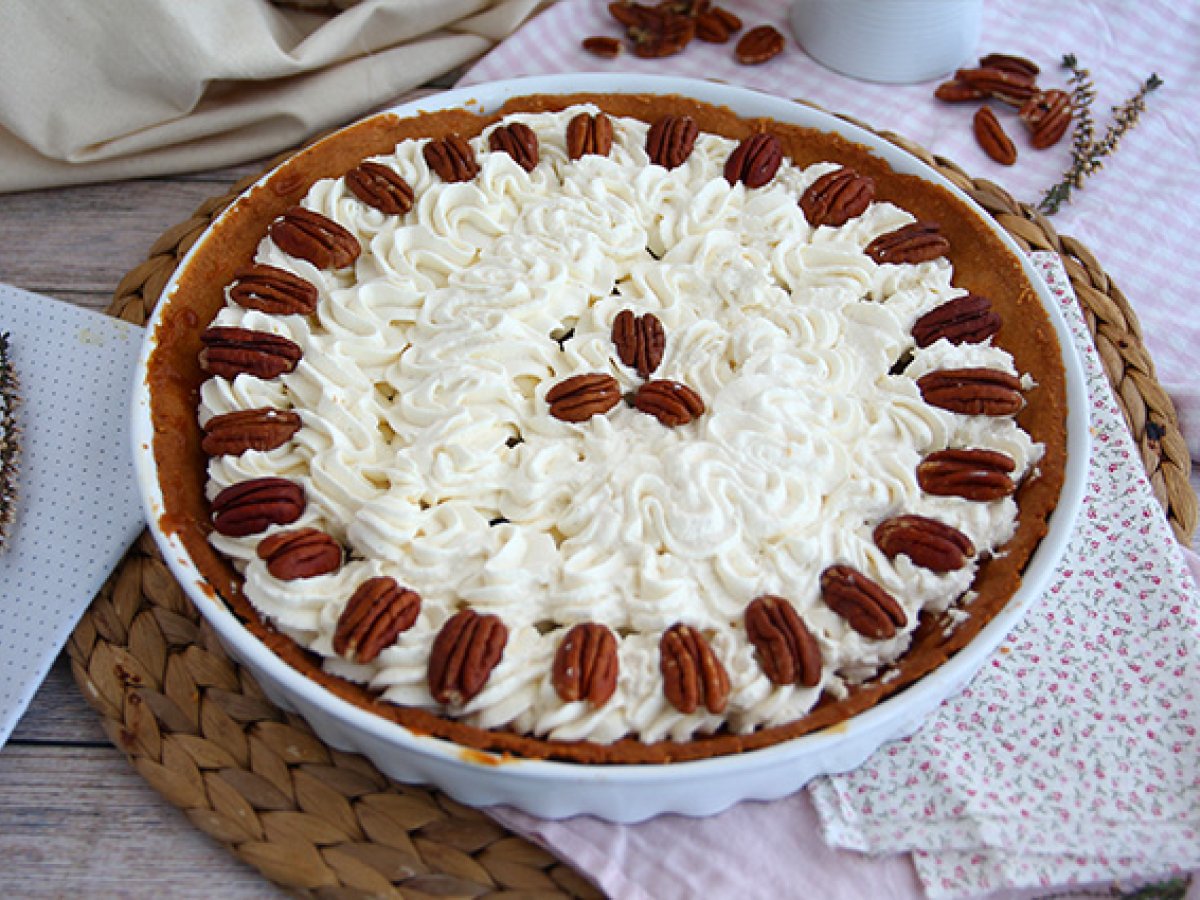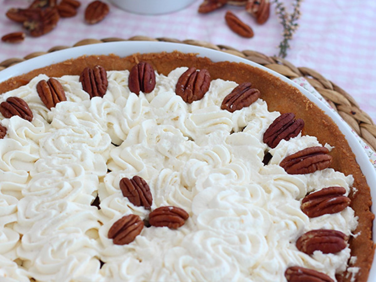 A questo punto mettete la crema in un sac à poche e distribuitela sulla superficie della torta. Per finire, decorate con le noci Pecan.