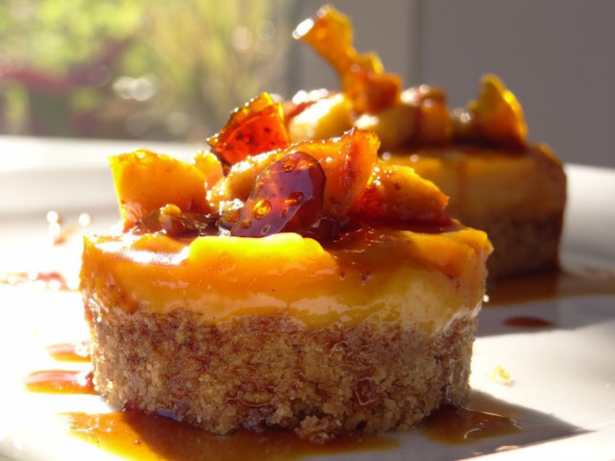 Tortino alla cannella con crema all'albicocca e pesche caramellate