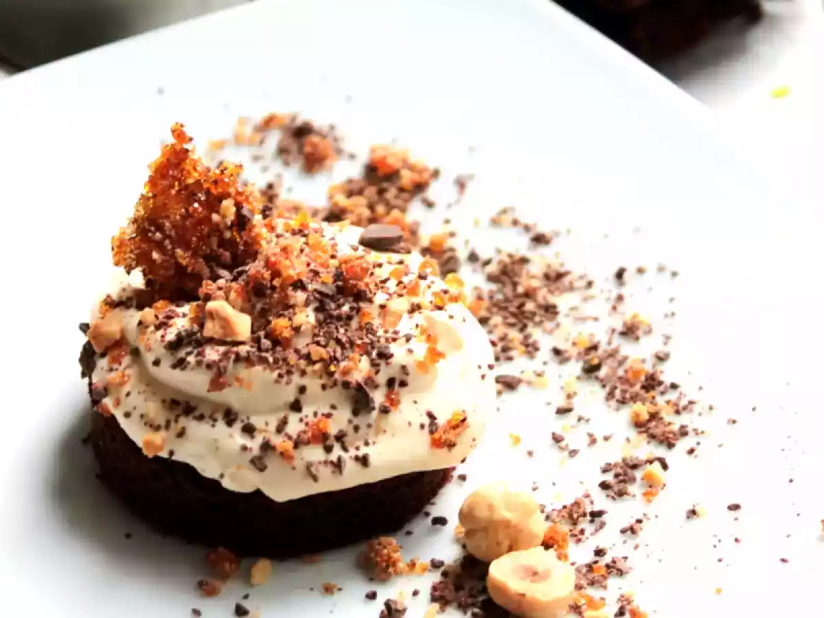 Tortino morbido al mascarpone con croccante alle nocciole e fondente