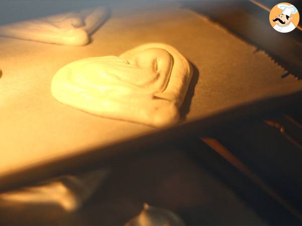 Disegnate dei cuori sulla carta da forno. Poi riempite un sac à poche con la meringa e formate dei cuori seguendo i tratti che avete disegnato.