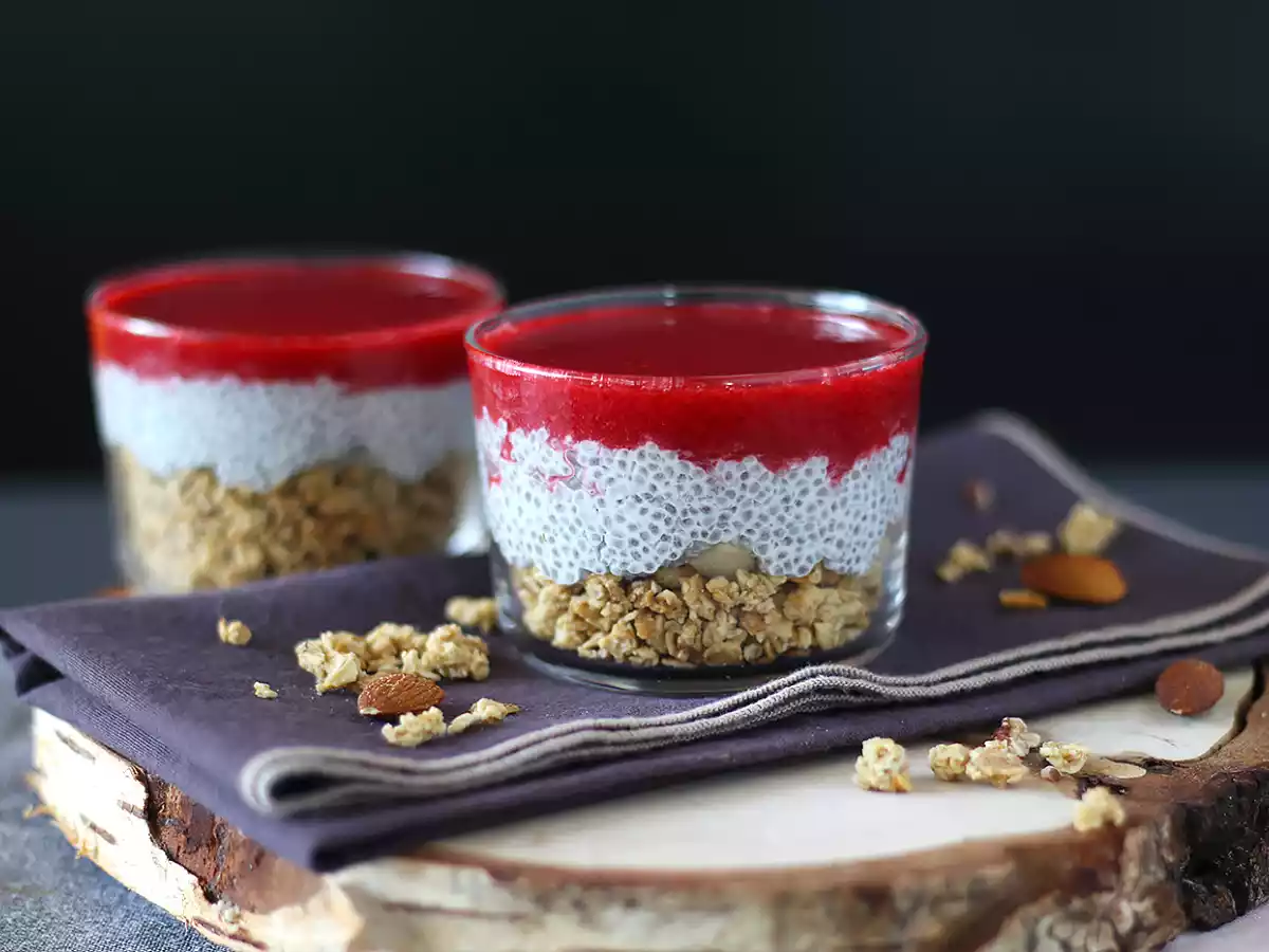 Come si prepara un pudding di chia? Semplicemente mescolando i semi di chia con del latte vegetale. Poi abbiamo aggiunto la granola per un tocco di croccantezza e lamponi frullati per dare il massimo di golosità alla ricetta. Provate questo meraviglioso dessert senza cottura, lo amerete alla follia!