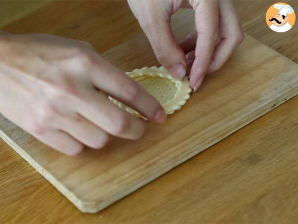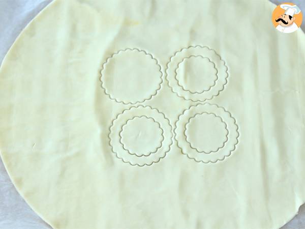 Srotolate la pasta sfoglia. Tagliate 4 dischi con il coppapasta più grande. Poi ricavate 3 dischi con quello più piccolo, all'interno dei dischi grandi. (Guardate il tutorial video a fondo pagina se non vi è chiaro il procedimento)