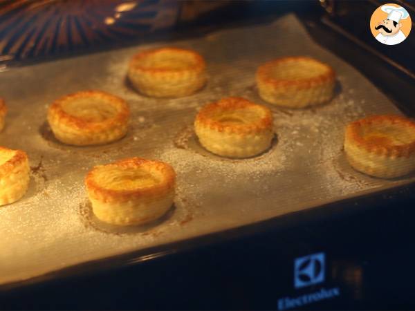 Ripetete l'operazione per fare 8 vol au vent. Spennellateli tutti con l'uovo sbattuto per una migliore doratura e spolverate di zucchero a velo. Infornate per 20 minuti a 180°. Lasciate raffreddare