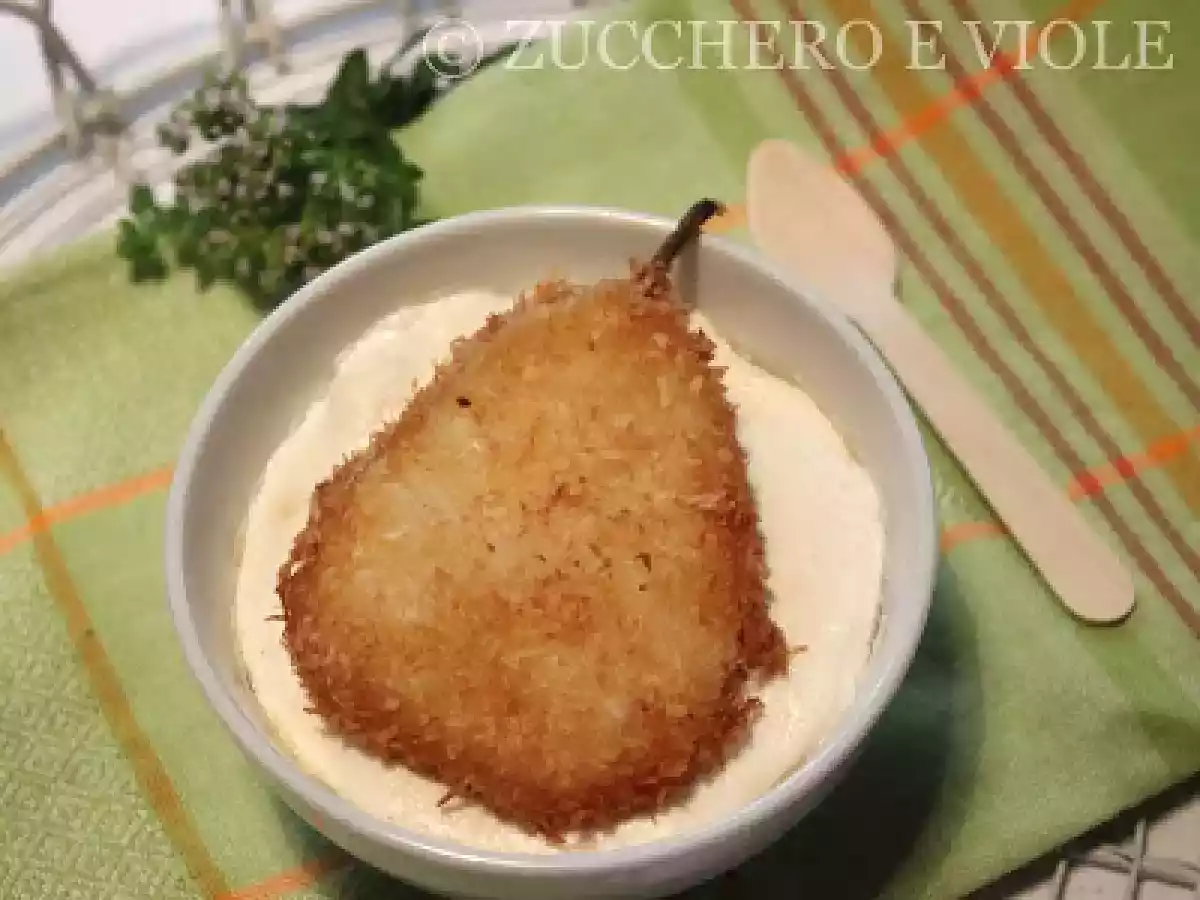 Yogurt al forno con pere caramellate vota adesso Dessertmedia1 h 10 m Invia questa ricetta ad un amico Stampa la ricetta Contatta l'autore della Ricetta Pubblica la foto di questa ricetta Ingredienti 4 200 g yogurt greco 3 medie pere un pizzico cannella qb miele 8 cucchiai zucchero 1 albume 1/2 bacca vaniglia Per la decorazione due fette intere pere farina 00 farina di cocco 1 uovo rum 1 limone olio per friggere