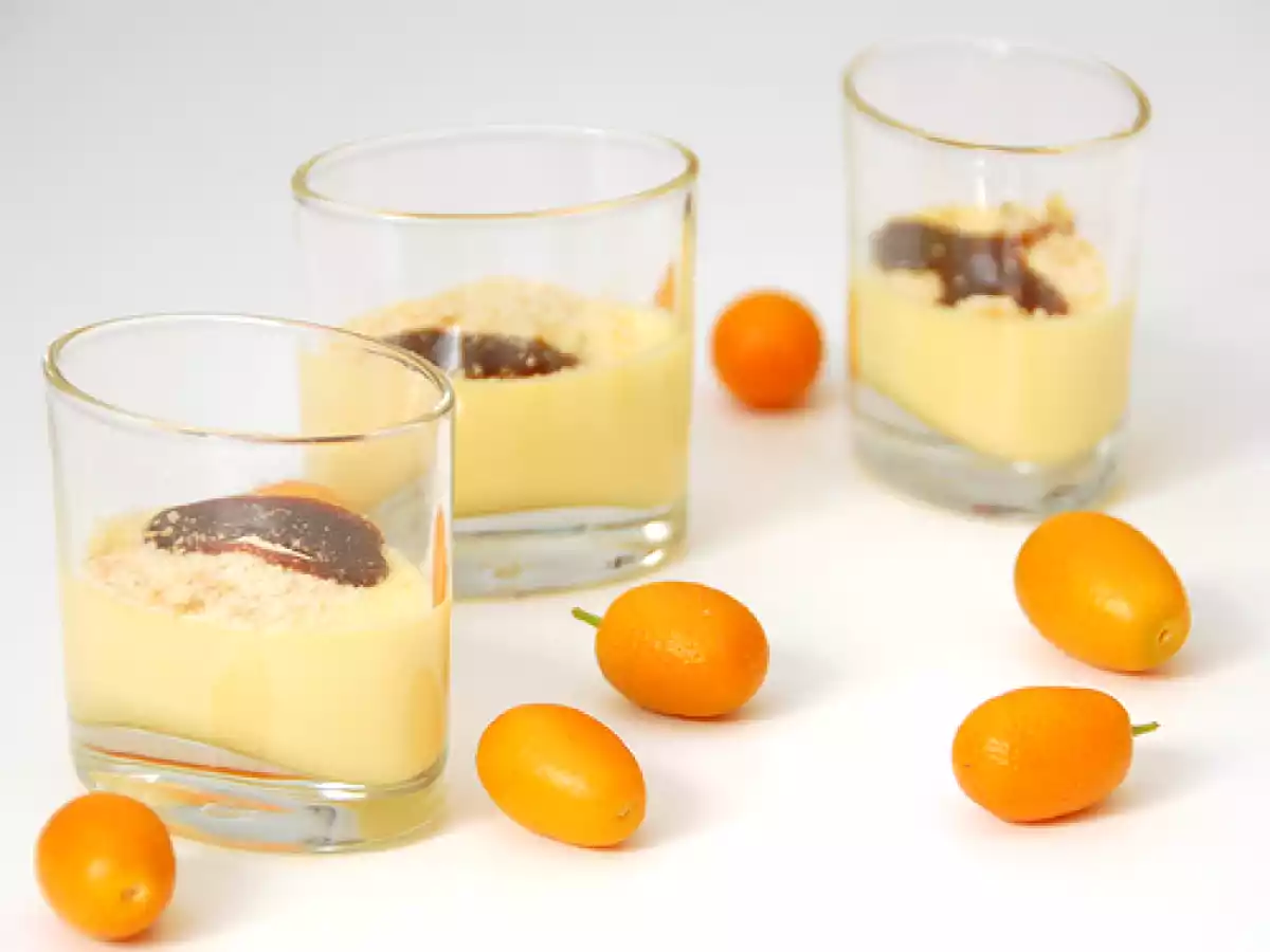 - Con le fruste elettriche montate bene le uova con lo zucchero e untevi la farina, incorporandola con una spatola. Versatevi a filo il latte, montando di nuovo con le fruste e trasferite il composto nello stesso casseruolino del latte. Unite la scorze tritata di kumquat e le gocce di olio di arancio o mandarino.