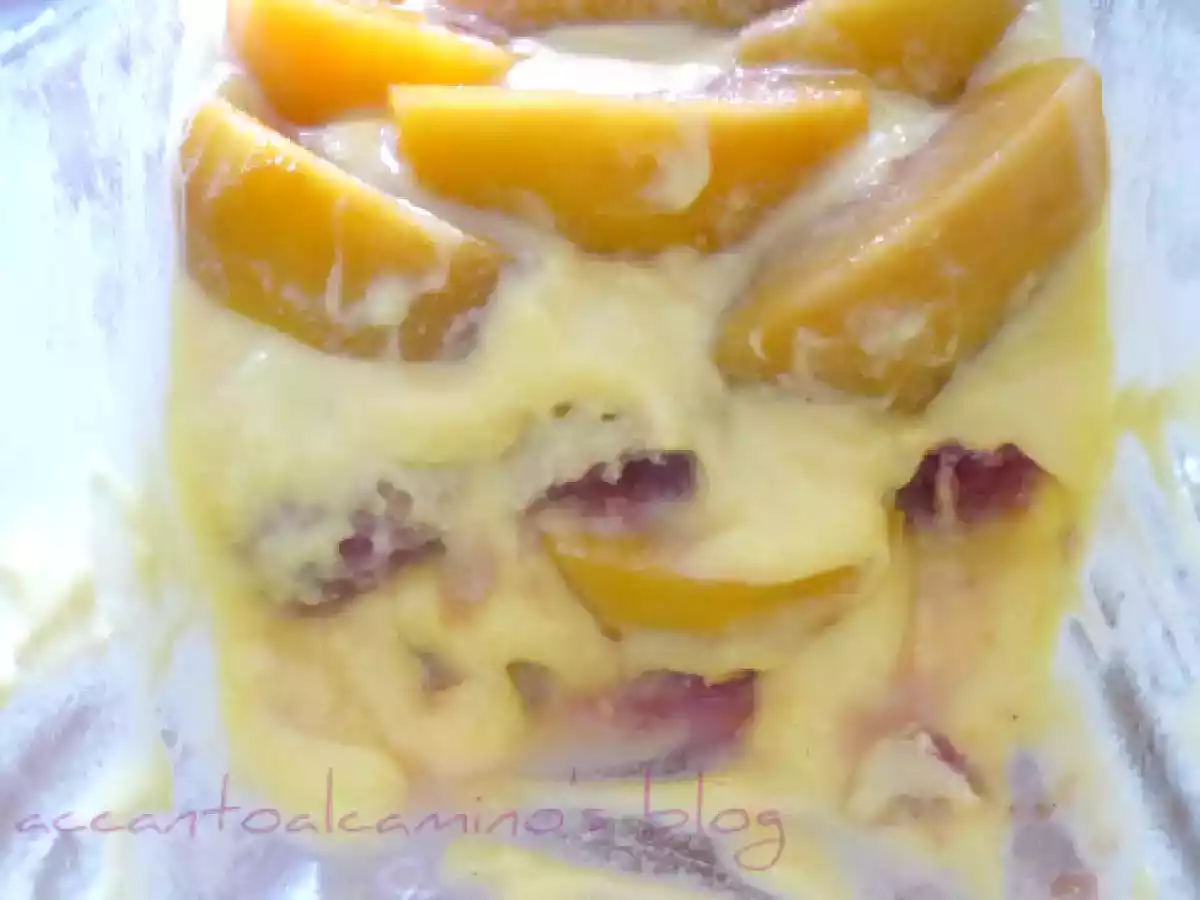 Zuppa inglese con le pesche vota adesso PrecedenteProssimo Dessertfacile50 min Invia questa ricetta ad un amico Stampa la ricetta Contatta l'autore della Ricetta Pubblica la foto di questa ricetta Ingredienti 2 6 pesche ben mature ma sode 2 cucchiai di zucchero 2 limoni bio 4 tuorli 2 cucchiai di zucchero 2 cucchiai di farina 1 pizzico di sale 1 limone bio 3/4 lt. latte savoardi q.b., Alchermes q.b.