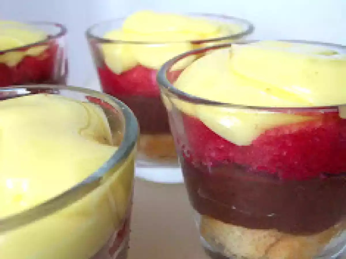 Zuppa inglese vota adesso PrecedenteProssimo Dessertmedia2 ore Invia questa ricetta ad un amico Stampa la ricetta Contatta l'autore della Ricetta Pubblica la foto di questa ricetta Vuoi un dessert veloce? Ingredienti 4 crema pasticcera 500 ml cacao amaro 4 cucchiai savoiardi da inzuppare grandi 6-7 alchermes 1 tazza sassolino 1\2 tazza succo di frutta a piacere (io lo uso all'albiccocca) 1\2 tazza