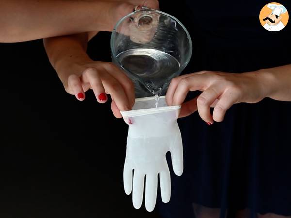 Versate l'acqua nei guanti usa e getta, lasciando un piccolo spazio in alto in modo da poter fare un nodo per chiudere il guanto. Mettete le mani piatte nel congelatore per almeno 6 ore. (Vi consigliamo di farne più di una perché potrebbero prendere delle forme diverse o le dita potrebbero rompersi. Così almeno potrete conservare la migliore)