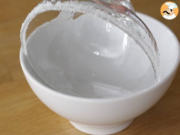 Adesso girate i bordi del bicchiere in una coppetta con il sale. La brinatura dei bordi è essenziale per questo tipo di cocktail.