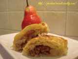 Ingredienti: 1 rotolo di pasta sfoglia rettangolare 50 gr di zucchero di canna 20 gr di burro 2 pere 1 manciata di noci 1 cucchiaino di cannella 1 uovo