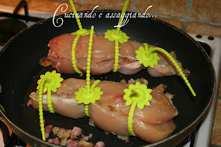 1 petto di pollo tagliato a metà - 150 gr di pancetta affumicata a cubetti - 100 gr di castagne NOBERASCO - un bicchiere di vino bianco - sale di Cervia alla salicornia - olio evo
