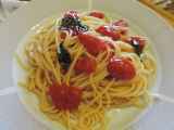 Ingredienti: 350 g di spaghetti 200 g di gamberi grigi 20 pomodorini datterini 2 spicchi d'aglio mezzo peperoncino 3 cucchiai di olio extra vergine basilico...