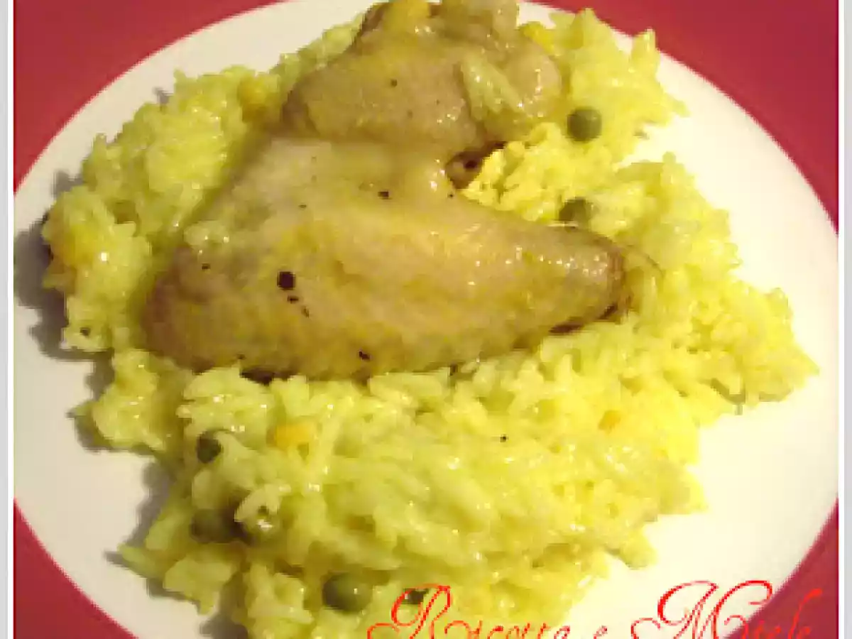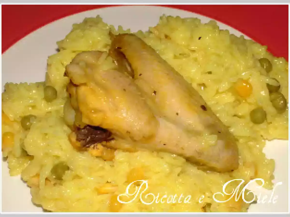 Alette di pollo con riso basmati giallo PrecedenteProssimo Portata principalefacile35 min Invia questa ricetta ad un amico Stampa la ricetta Contatta l'autore della Ricetta Pubblica la foto di questa ricetta Del riso al pollo per un piacere ha volontà! Ingredienti 1 1 e ½ tazza di riso basmati 2 bustine di zafferano 6 alette di pollo 1 bicchiere di vino bianco 1 foglia d'alloro 1 foglia di basilico sale e pepe Piselli e mais 1 dado per brodo di verdure 1 noce di burro olio extravergine d'oliva