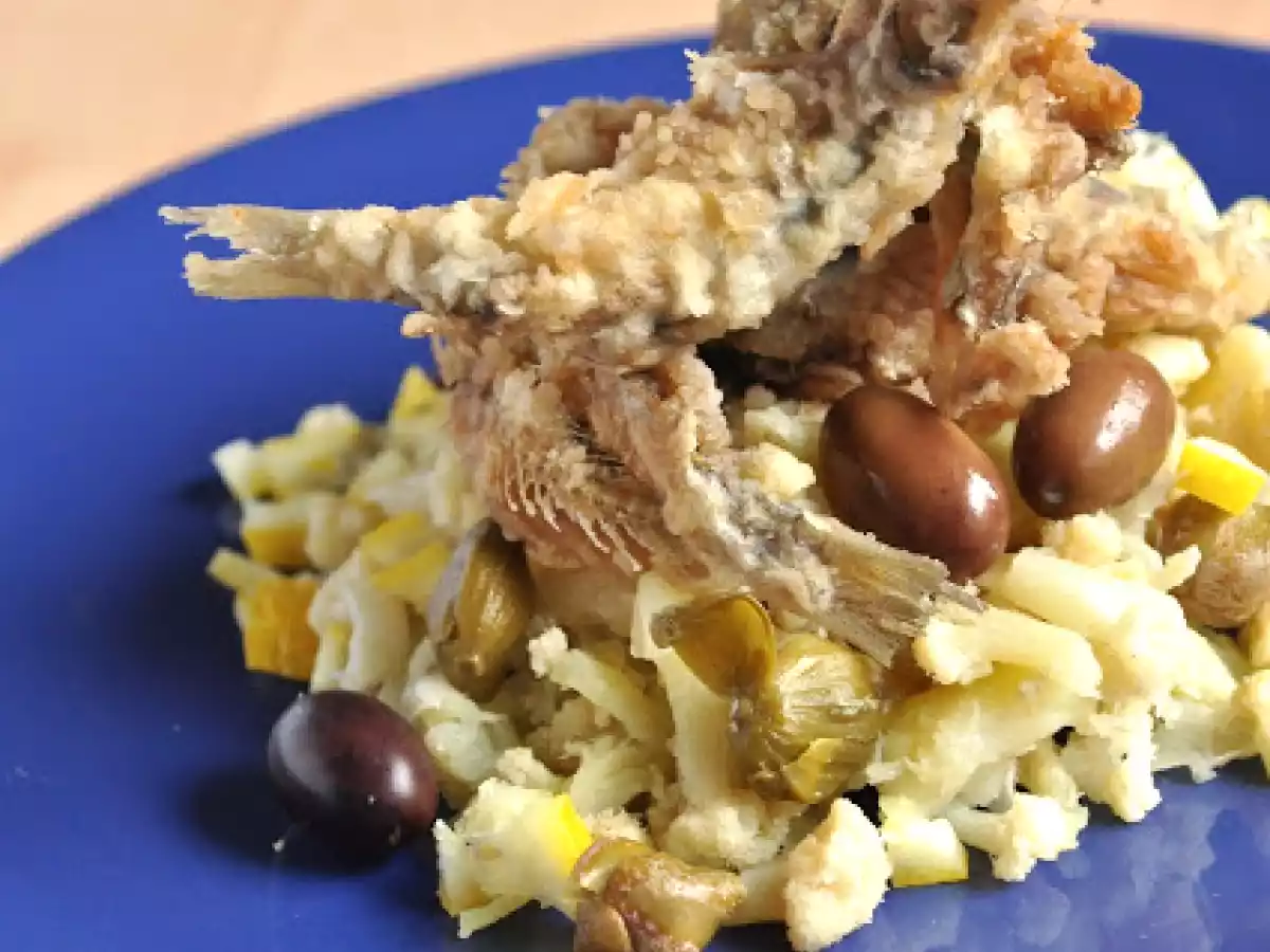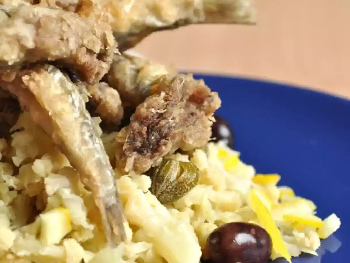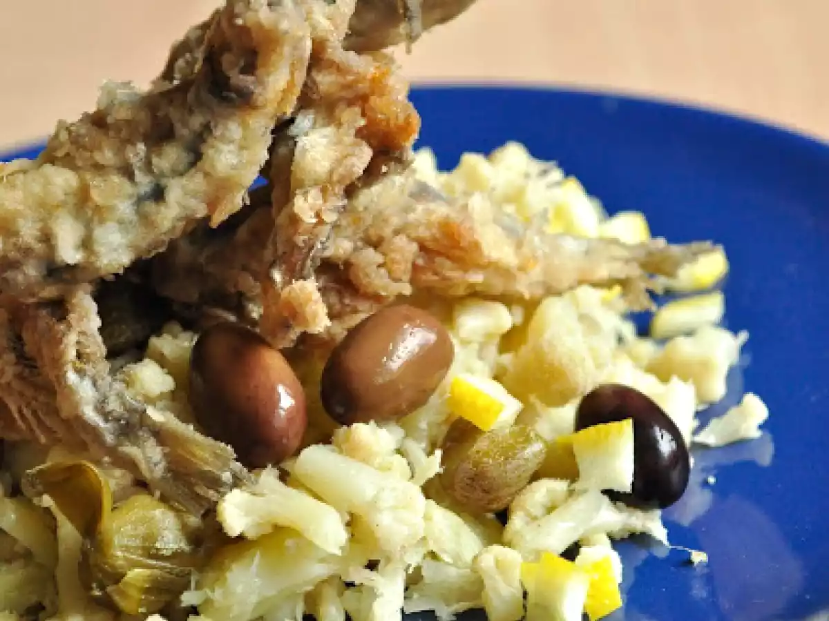 Alici nel paese dei cavolfiori vota adesso PrecedenteProssimo Portata principalefacile40 min Invia questa ricetta ad un amico Stampa la ricetta Contatta l'autore della Ricetta Pubblica la foto di questa ricetta Ingredienti 4 15 alici fresche 1 cavolfiore piccolo 30 capperi circa 15 olive taggiasche circa farina per impanare olio di semi buccia di mezzo limone sale e olio evo