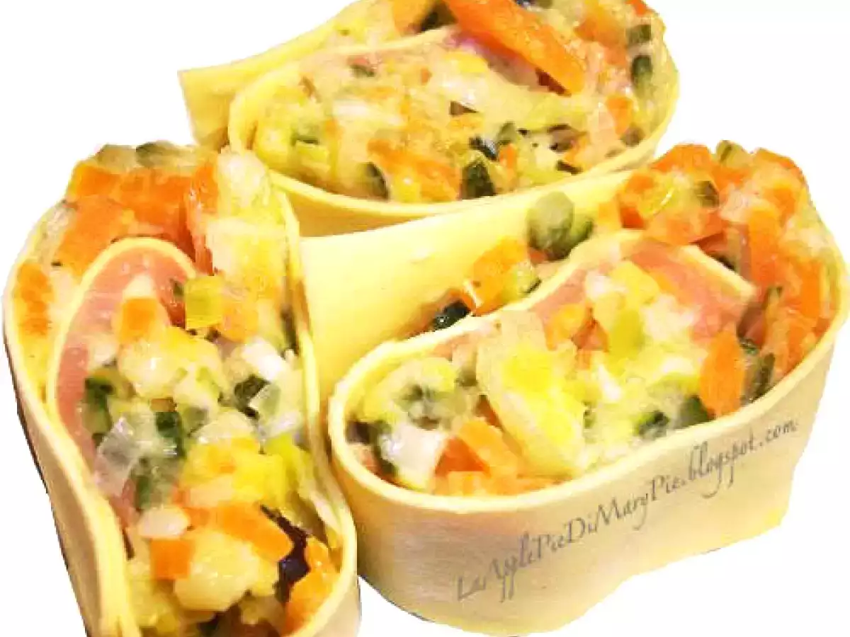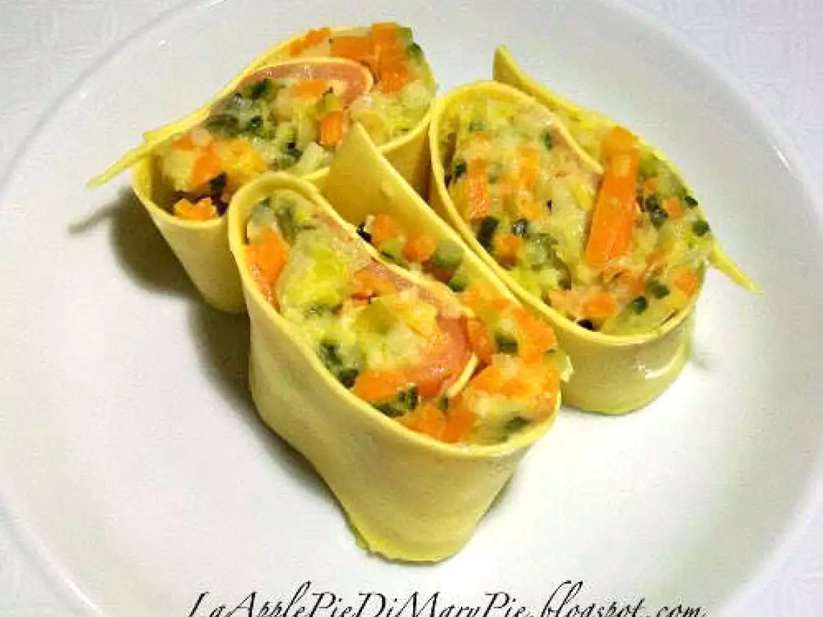 Anelli al salmone affumicato PrecedenteProssimo Portata principaleDifficile1 h 6 m Invia questa ricetta ad un amico Stampa la ricetta Contatta l'autore della Ricetta Pubblica la foto di questa ricetta Ingredienti 8 Per 8 persone Per la pasta: 200 g farina 0 2 uova sale Per farcire: 400 g zucchine 300 g carote 250 g porri 200 g panna liquida, fresca 200 g salmone affumicato a fettine g 200 80 g sedano 20 g parmigiano grattugiato olio d'oliva sale panna e burro per gratinare