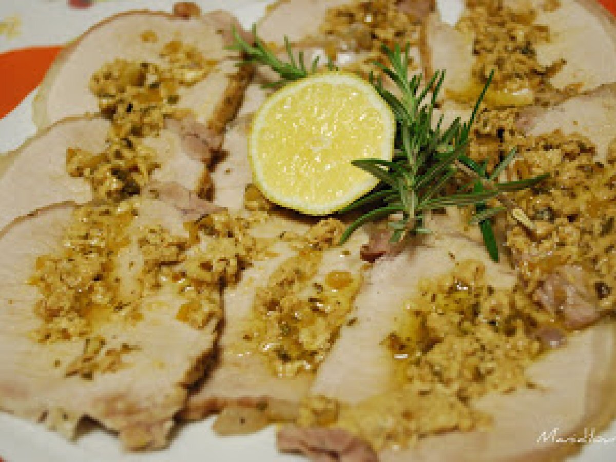 Arista di maiale al vin santo PrecedenteProssimo Portata principalefacile1 h 10 m Invia questa ricetta ad un amico Stampa la ricetta Contatta l'autore della Ricetta Pubblica la foto di questa ricetta Un piatto pieno di sapore e gioia per una ricetta molto semplice! Ingredienti 6 800 g di arista di maiale legata 2 bicchieri di vin santo 1 rametto di rosmarino 4 foglie di salvia 1 spicchio di aglio la buccia di uno spicchio di limone sale e pepe 2 cucchiai di olio evo 1 cucchiaino di farina bianca